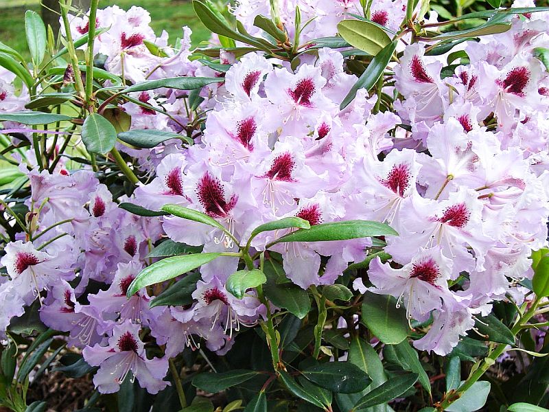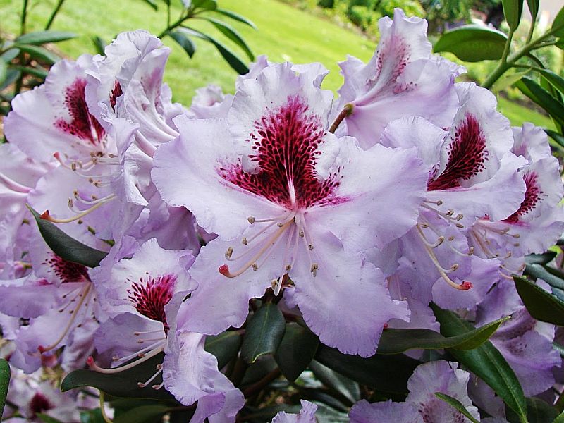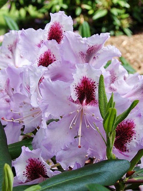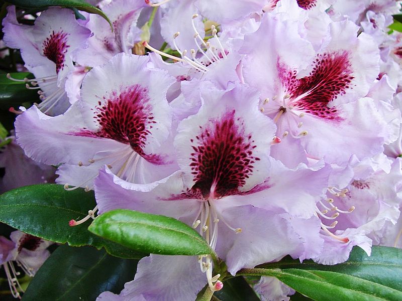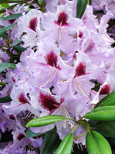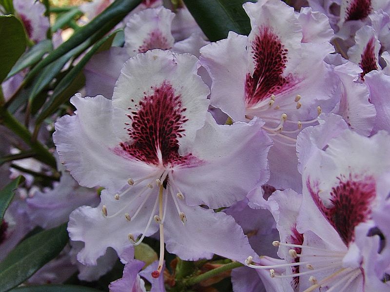 Kwiaty: w pąku liliowe, po otwarciu jasnoliliowe, z czasem bielejące z wyraźnym, czarno ciemnoczerwonym rysunkiem rozlewającym się na górnych płatkach... lejkowate, szeroko otwarte z wywiniętymi płatkami na zewnątrz... brzegi płatków pofalowane... duże, średnica pojedynczego kwiatu od około 6,5 do 8 cm... zebrane po 15-17 sztuk w wierzchołkowe kwiatostany