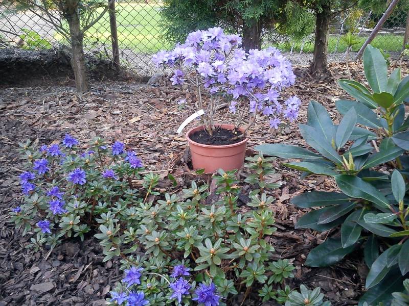 'Purple Pillow' po prawej a po lewej Rh 'Azurika'