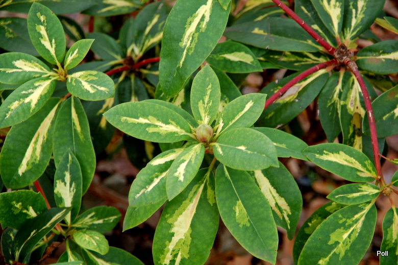 Liście: dwubarwne... ciemnozielone, błyszczące z nieregularnym złocistożółtym centrum
