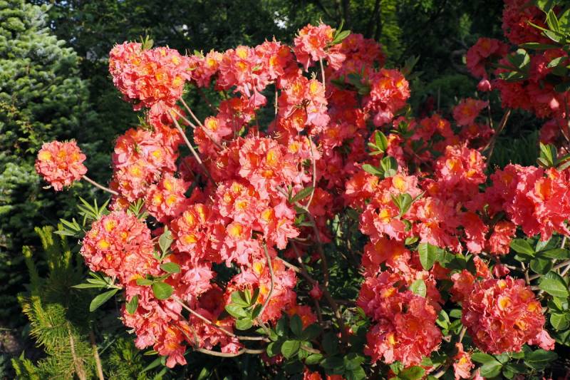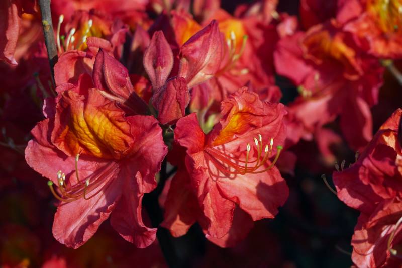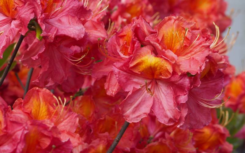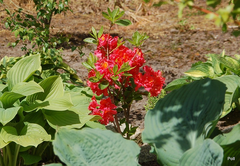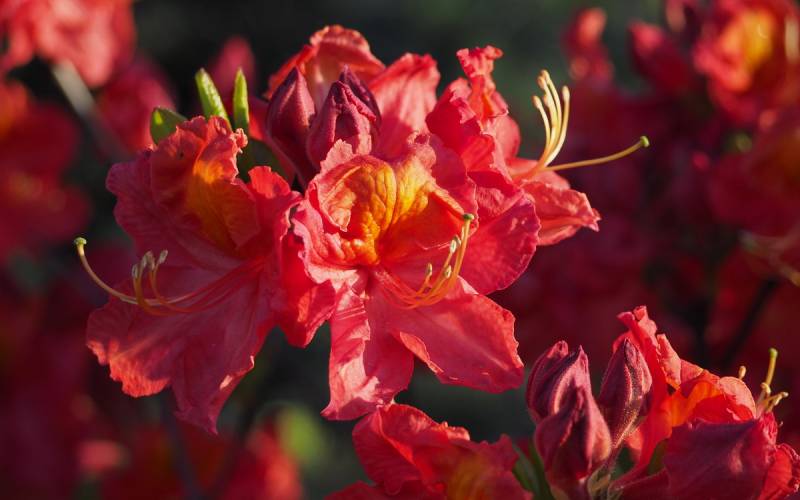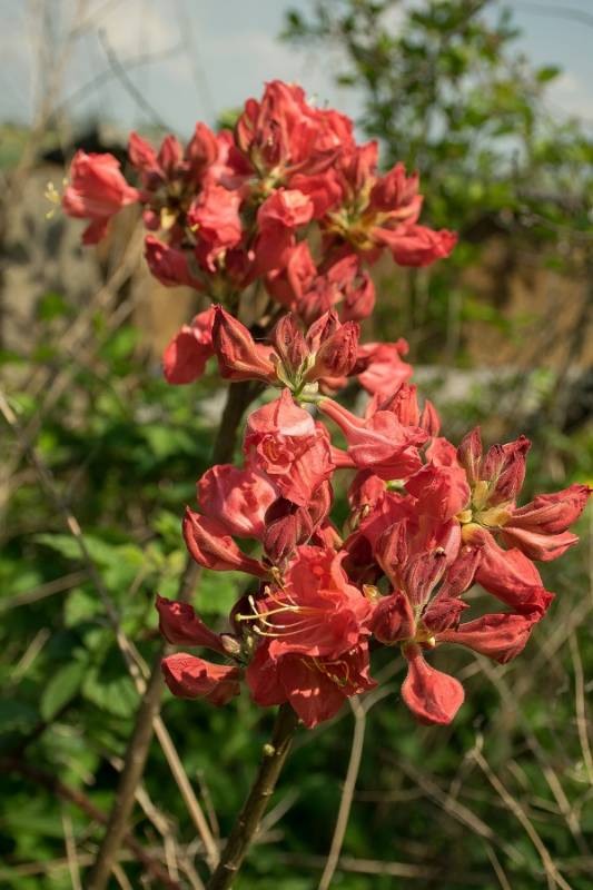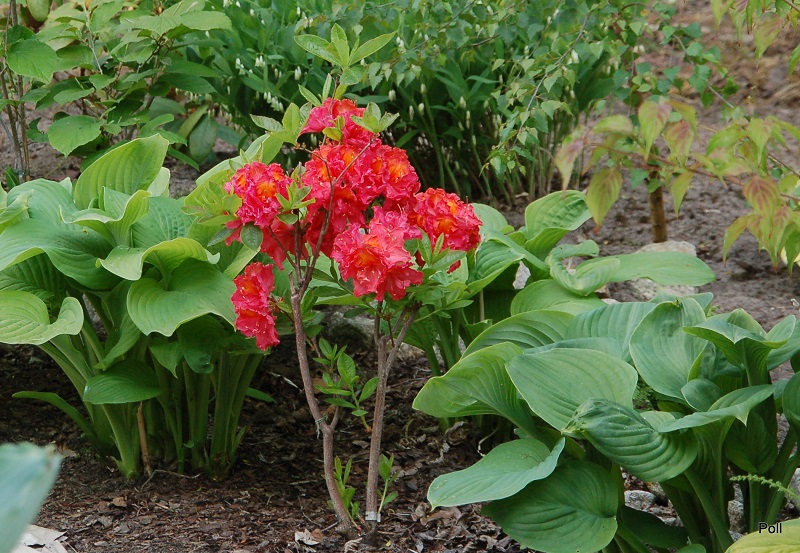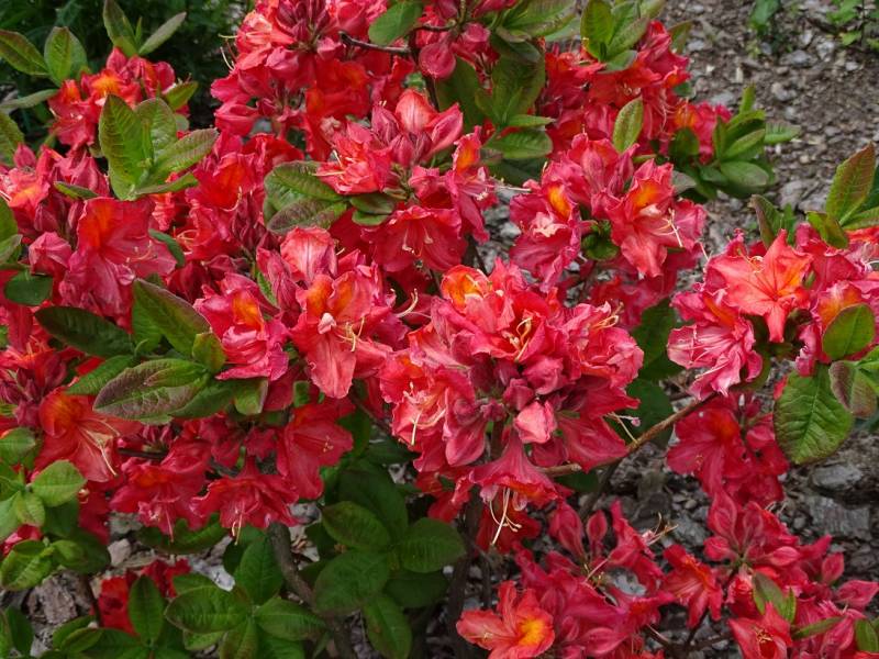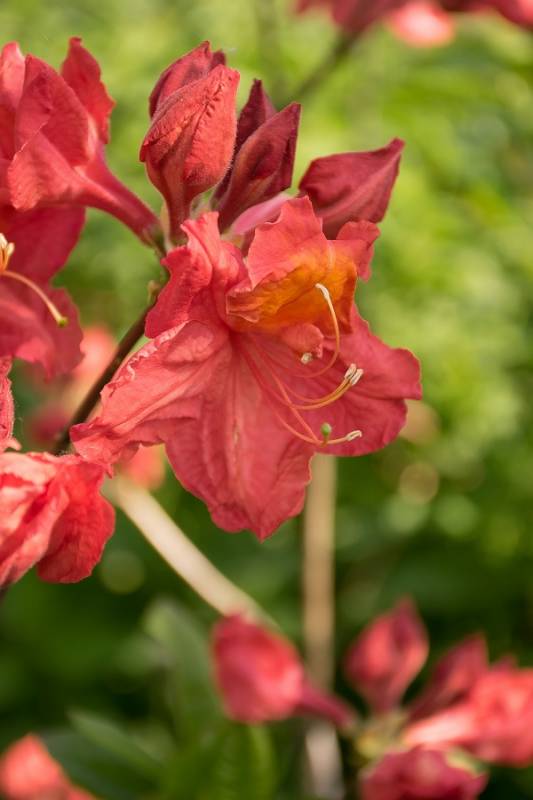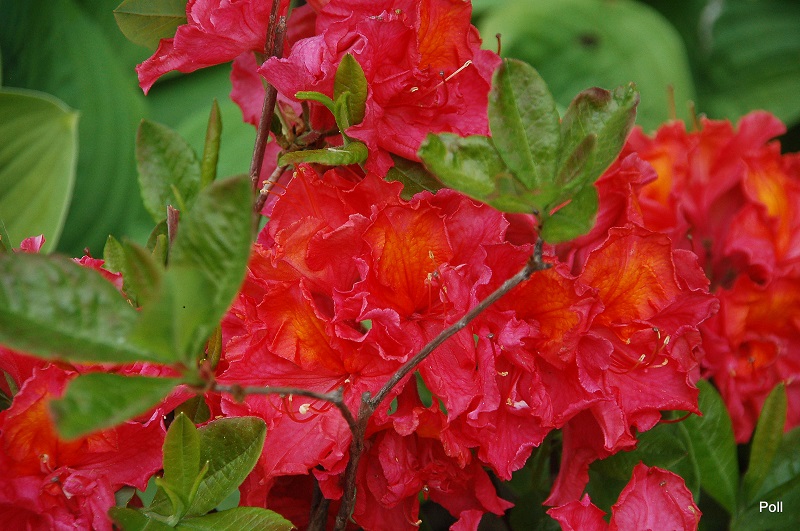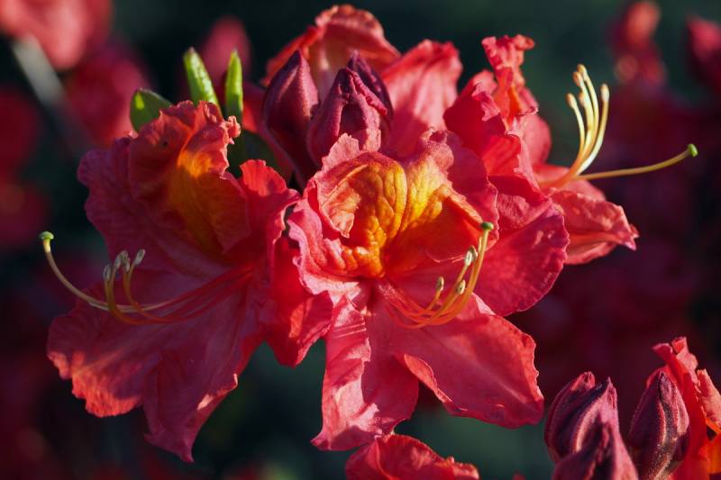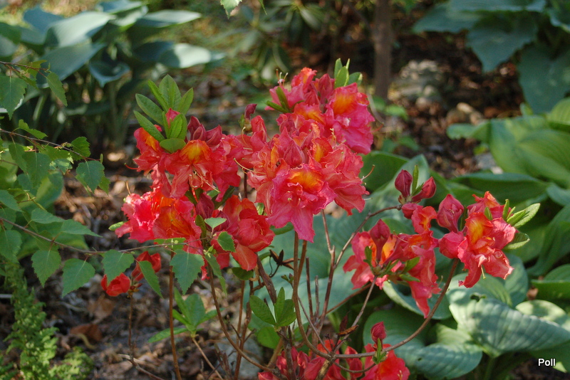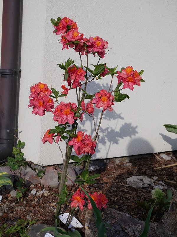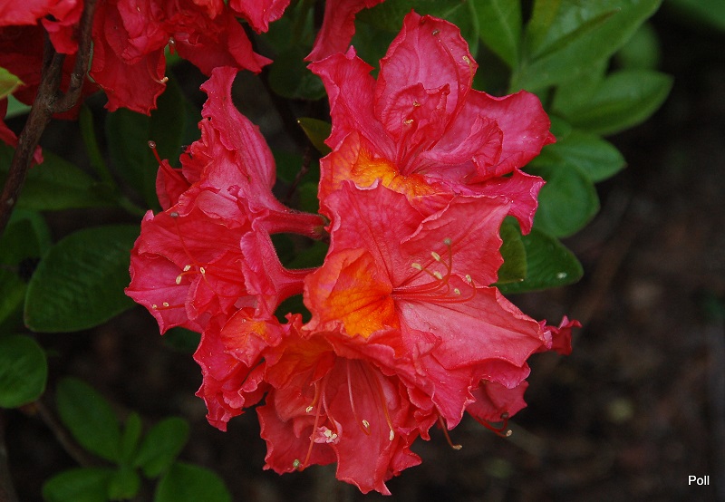 Kwiaty: w pąku prawie czerwone, po otwarciu ciemnoróżowe z dużą, złocistą do intensywnie pomarańczowej plamką rozlaną na górnym płatku... brzegi płatków pofalowane... średnica pojedynczego kwiatu od 6,5 do 7,5 cm... zebrane po 9-12 sztuk w kuliste, wierzchołkowe kwiatostany