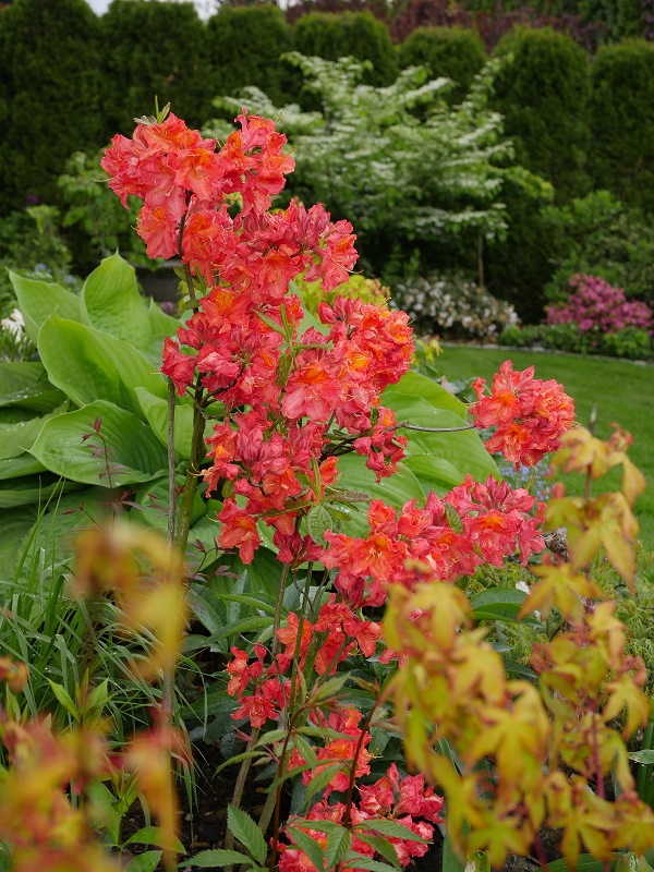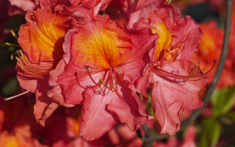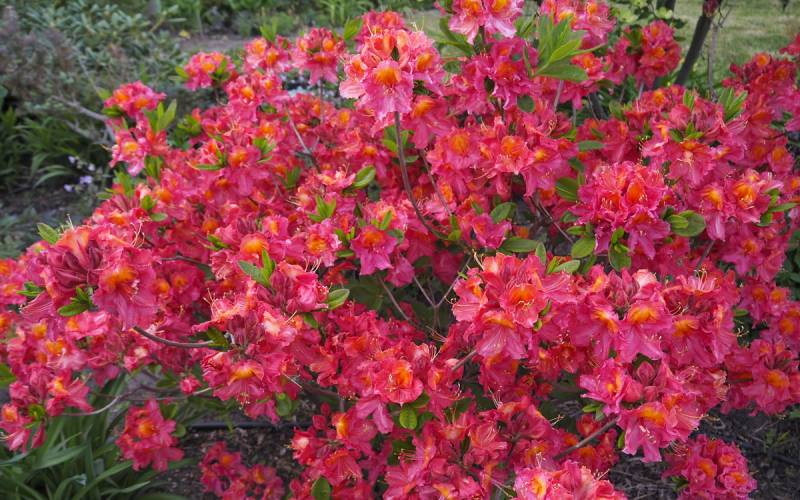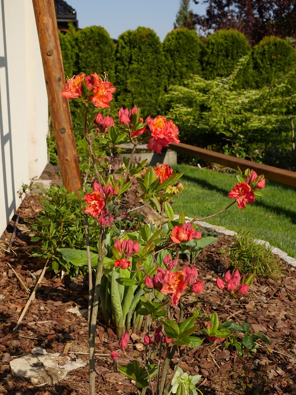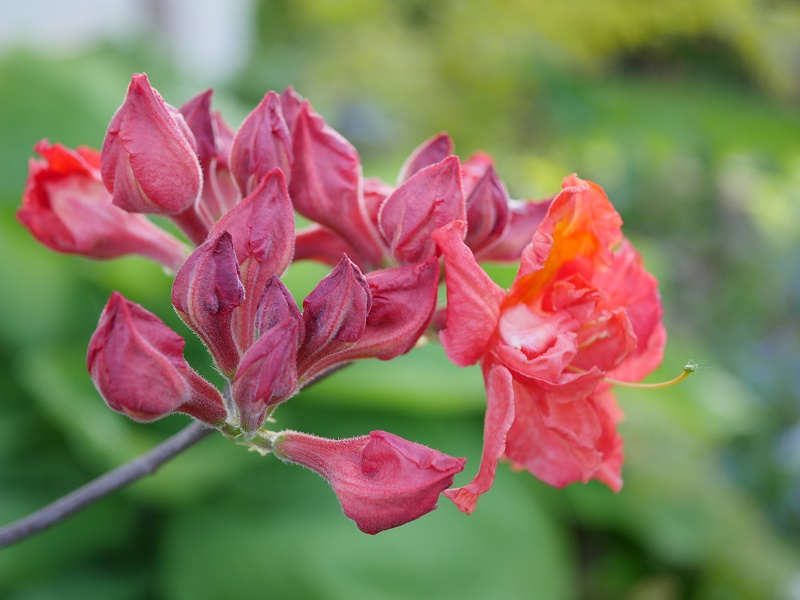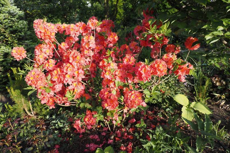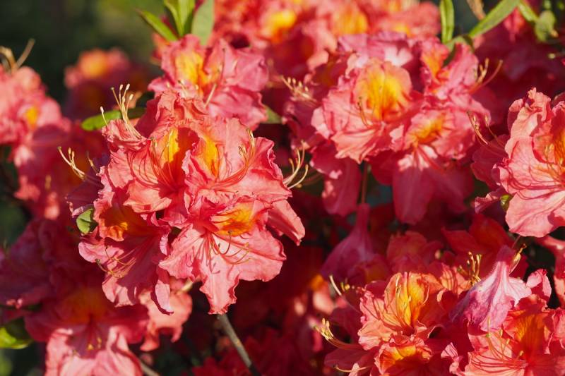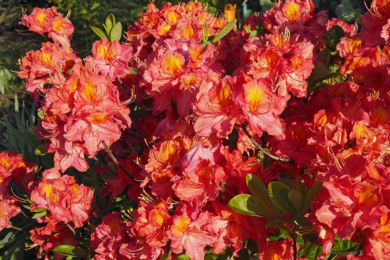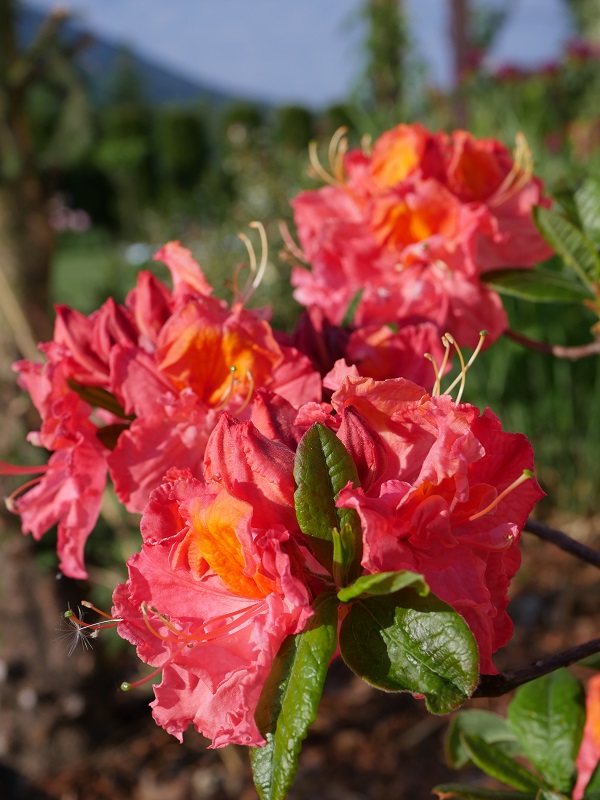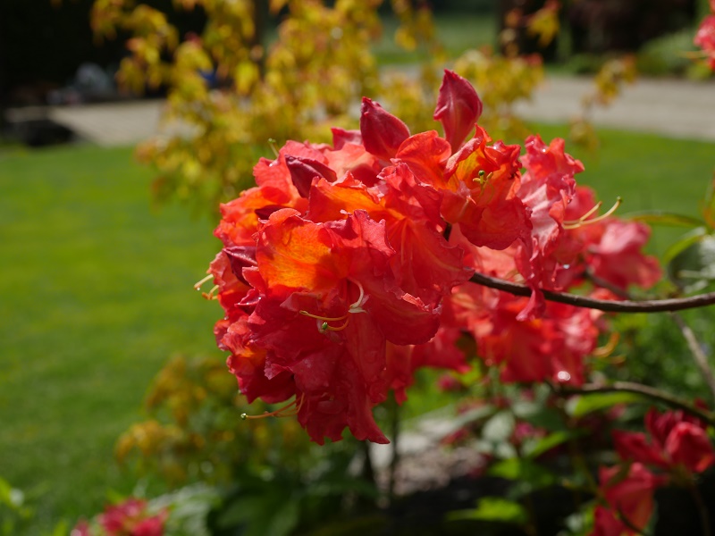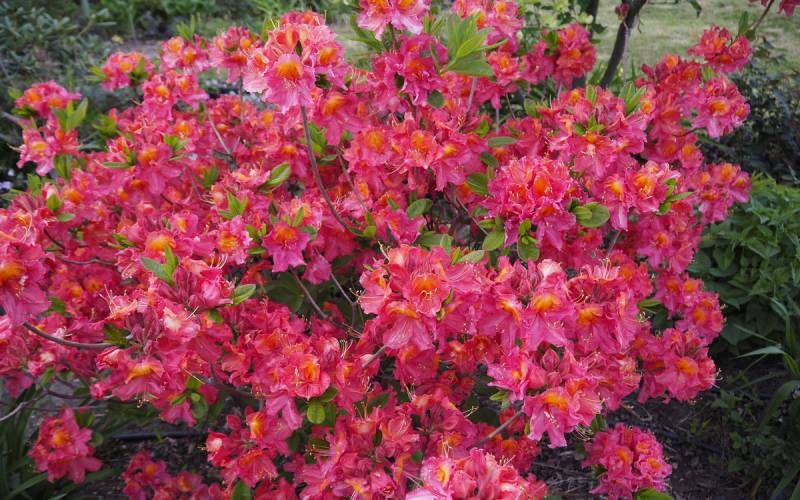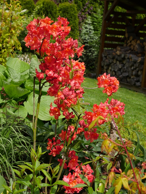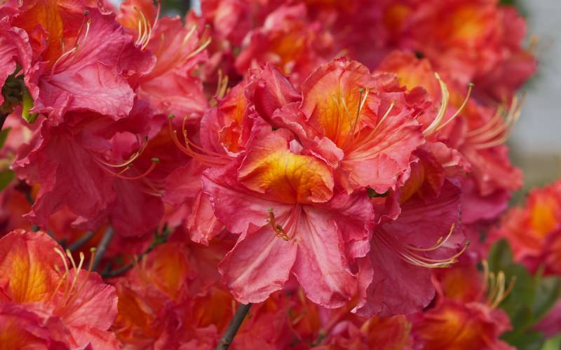 Kwiaty: w pąku prawie czerwone, po otwarciu ciemnoróżowe z dużą, złocistą do intensywnie pomarańczowej plamką rozlaną na górnym płatku... brzegi płatków pofalowane... średnica pojedynczego kwiatu od 6,5 do 7,5 cm... zebrane po 9-12 sztuk w kuliste, wierzchołkowe kwiatostany