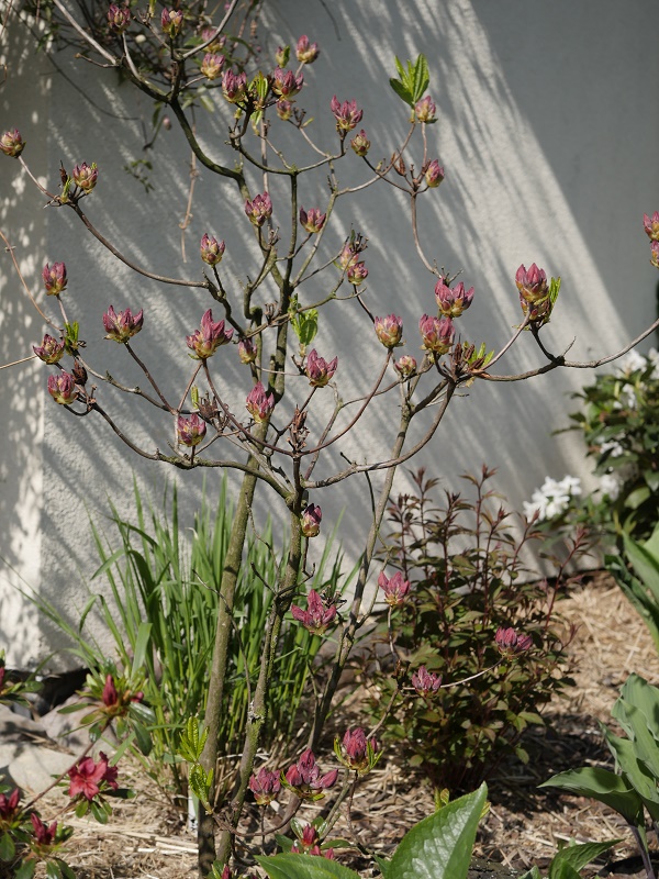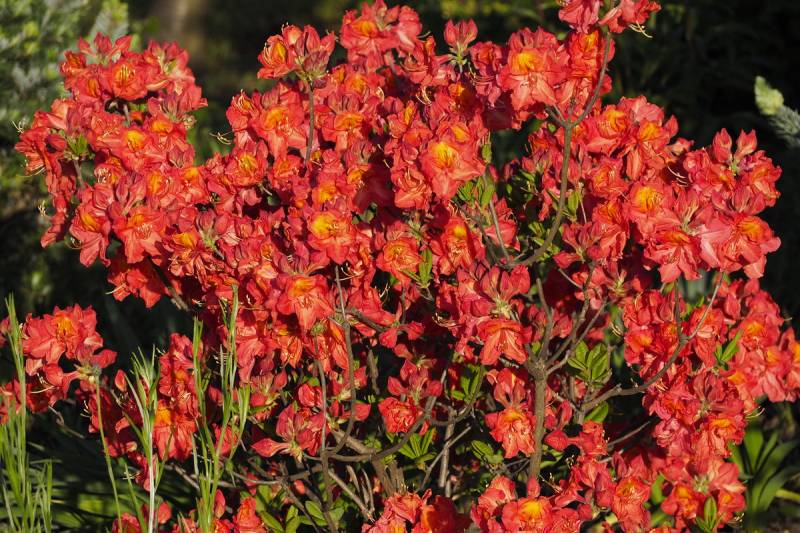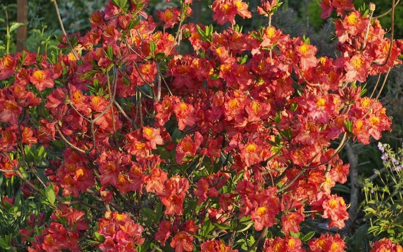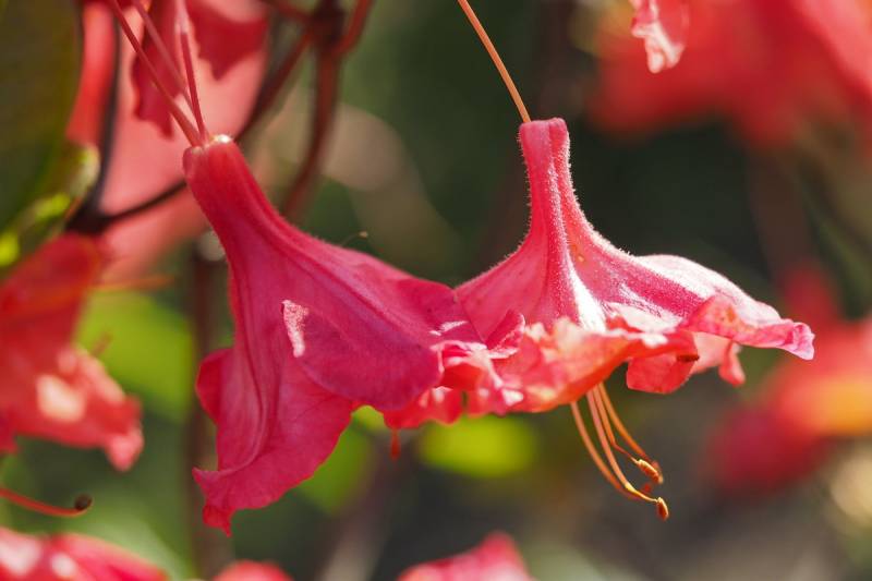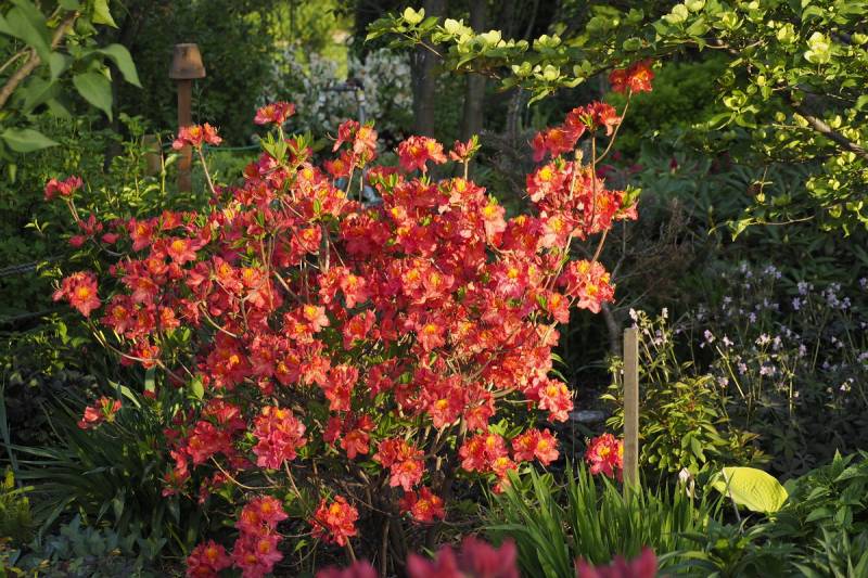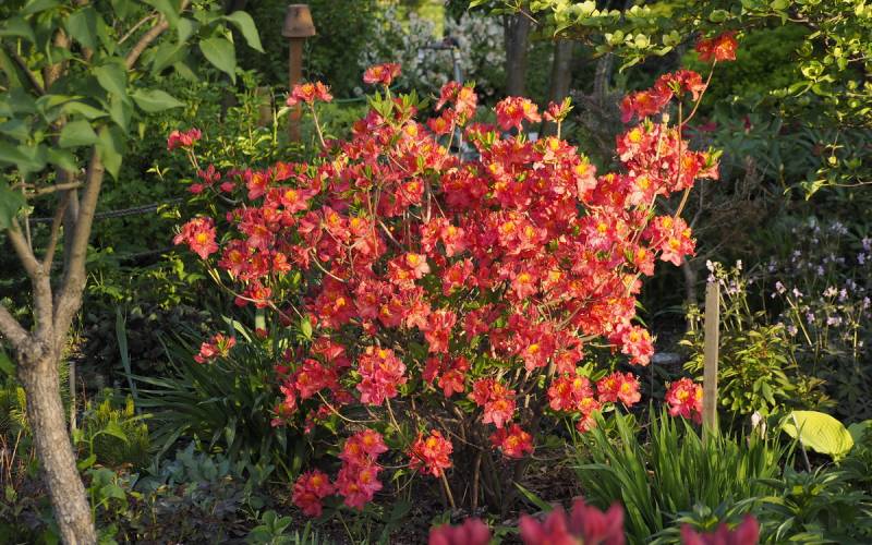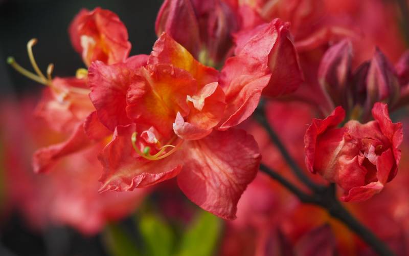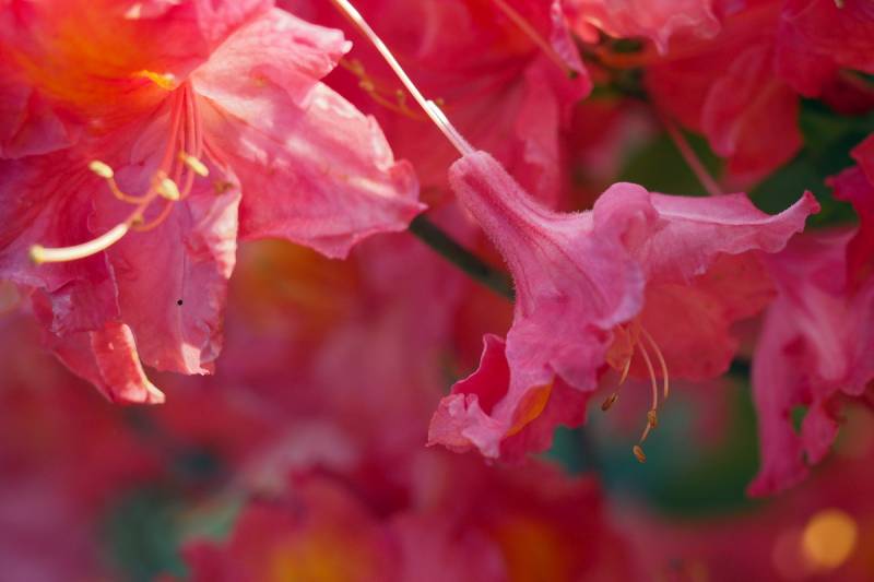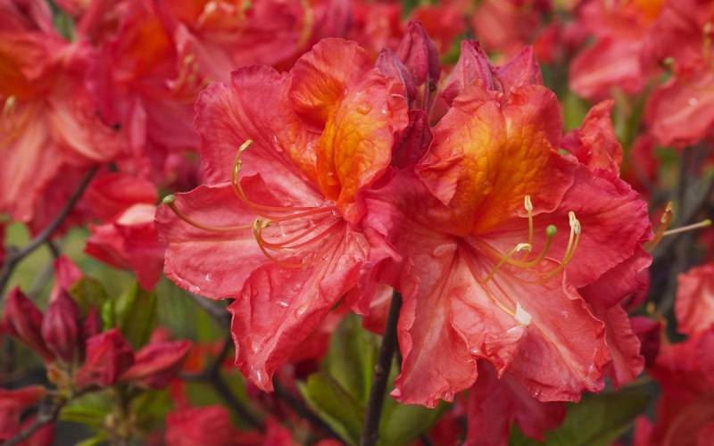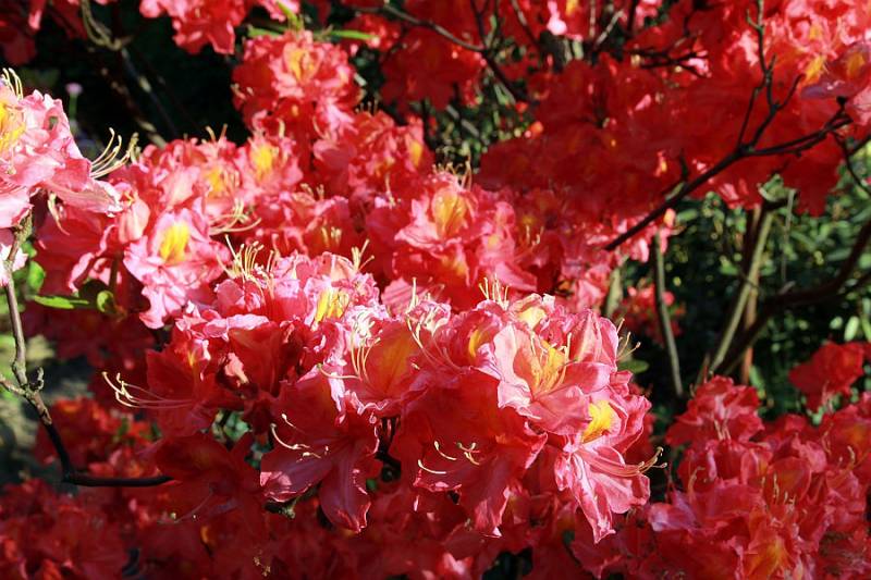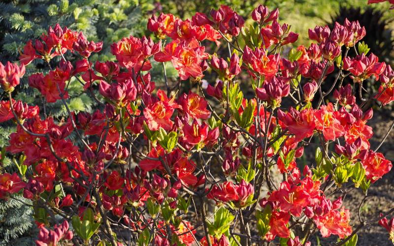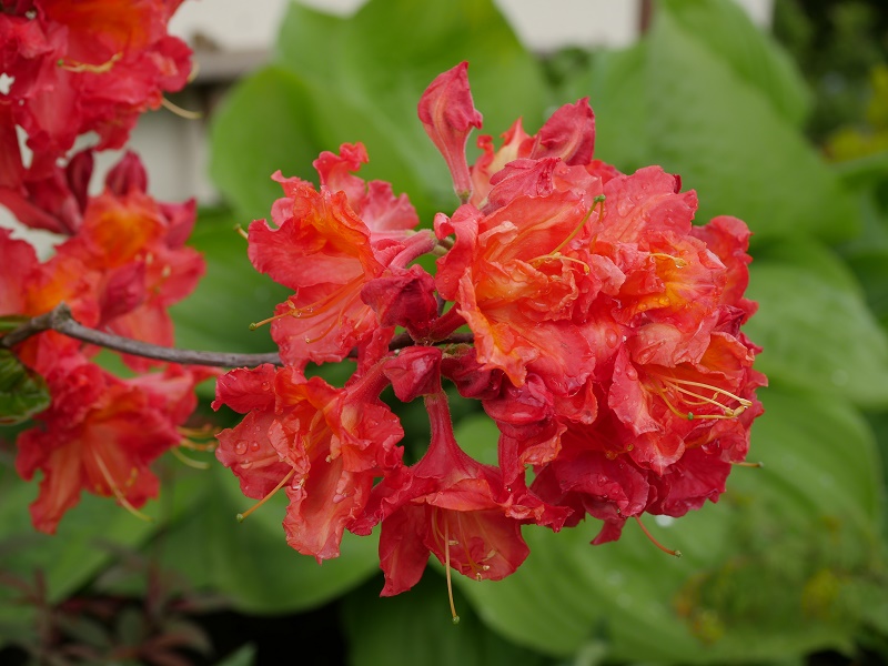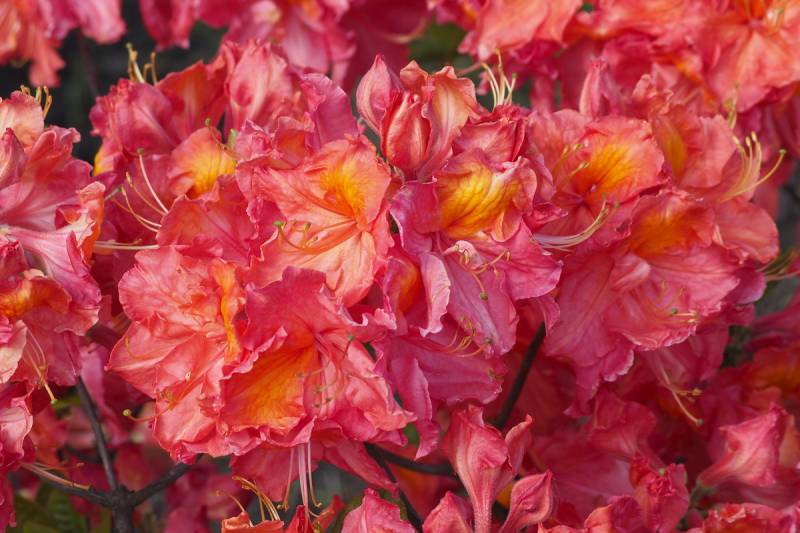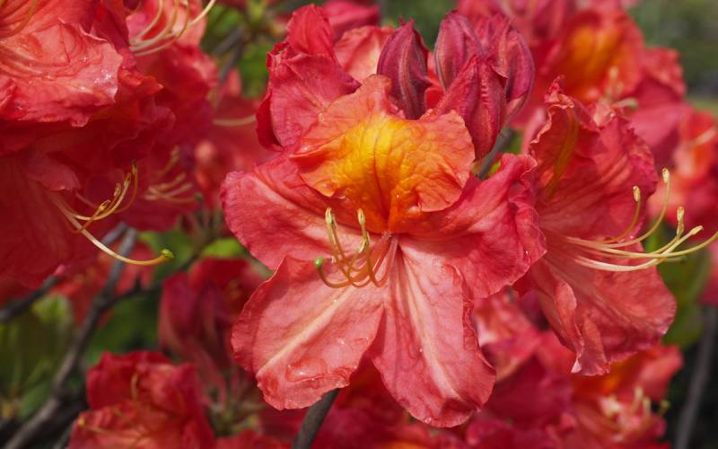 Kwiaty: w pąku prawie czerwone, po otwarciu ciemnoróżowe z dużą, złocistą do intensywnie pomarańczowej plamką rozlaną na górnym płatku... brzegi płatków pofalowane... średnica pojedynczego kwiatu od 6,5 do 7,5 cm... zebrane po 9-12 sztuk w kuliste, wierzchołkowe kwiatostany