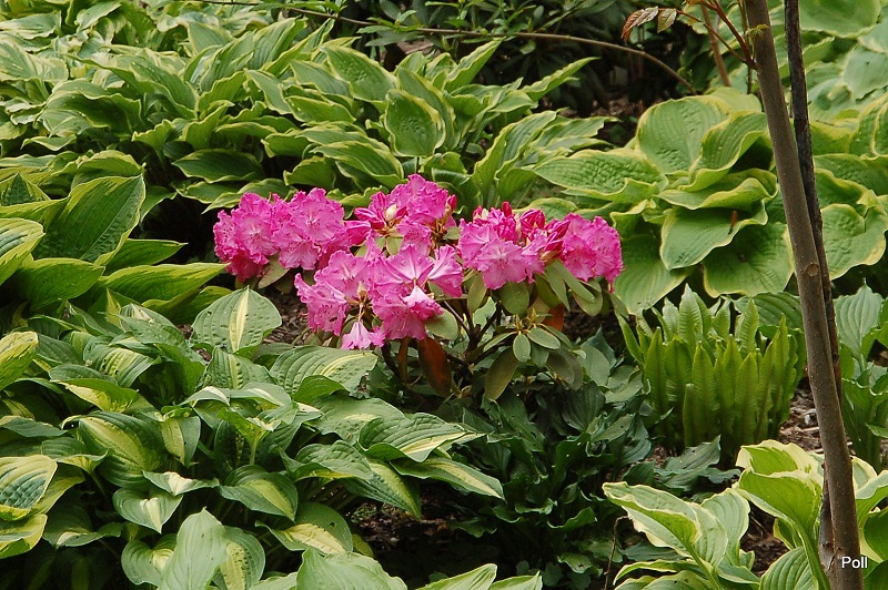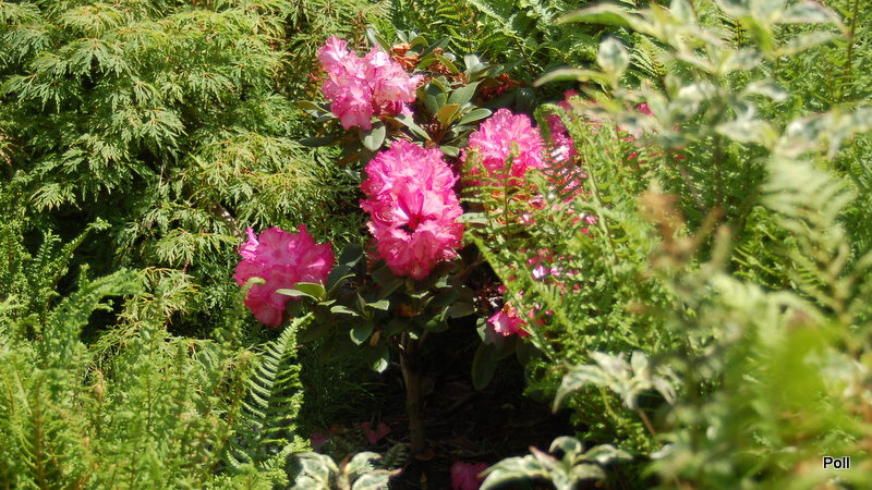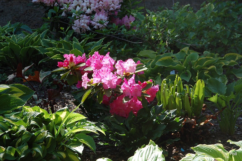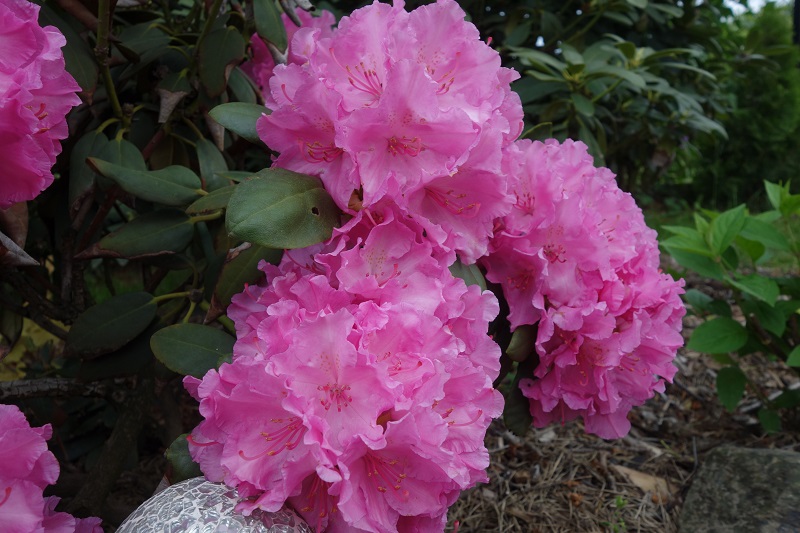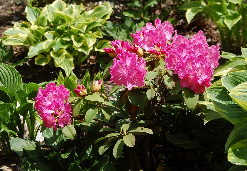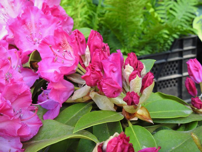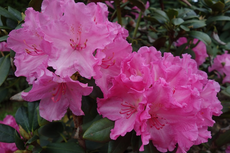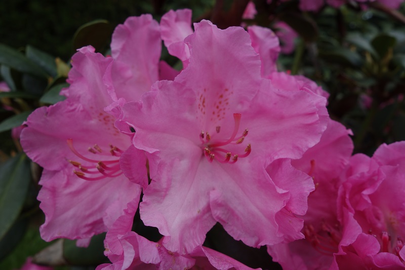 Kwiaty: w pąku ciemnoróżowe, po otwarciu równie intensywnie różowe, ale jaśniejące ku środkowi aż do białego z nielicznymi czerwonobrązowymi do pomarańczowoczerwonych cętkami na górnym płatku... brzegi płatków mocno pofalowane... duże, średnica pojedynczego kwiatu od 6 do 9 cm... liczne, zebrane po 12 do 19 sztuk w wierzchołkowe kwiatostany