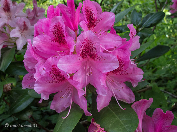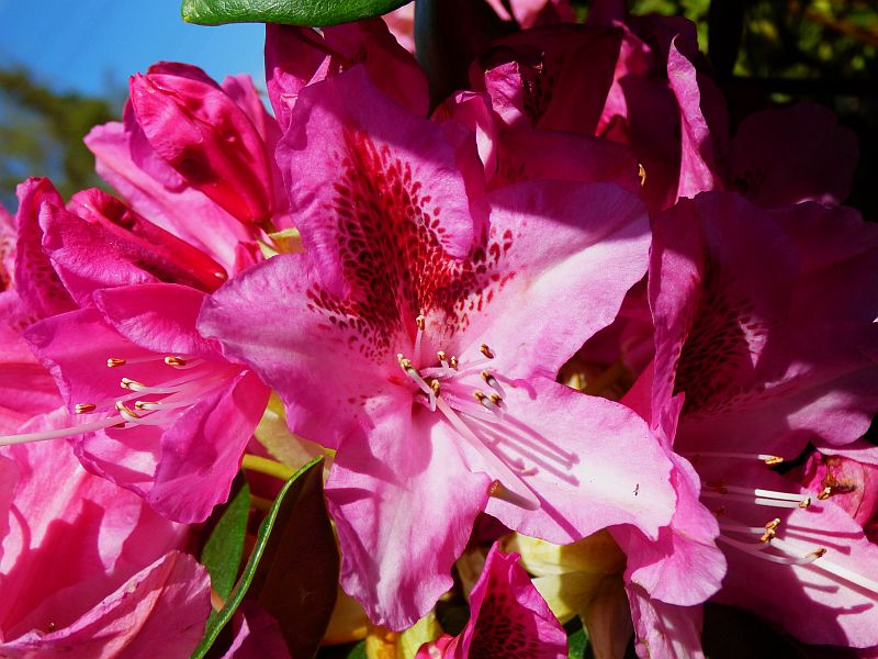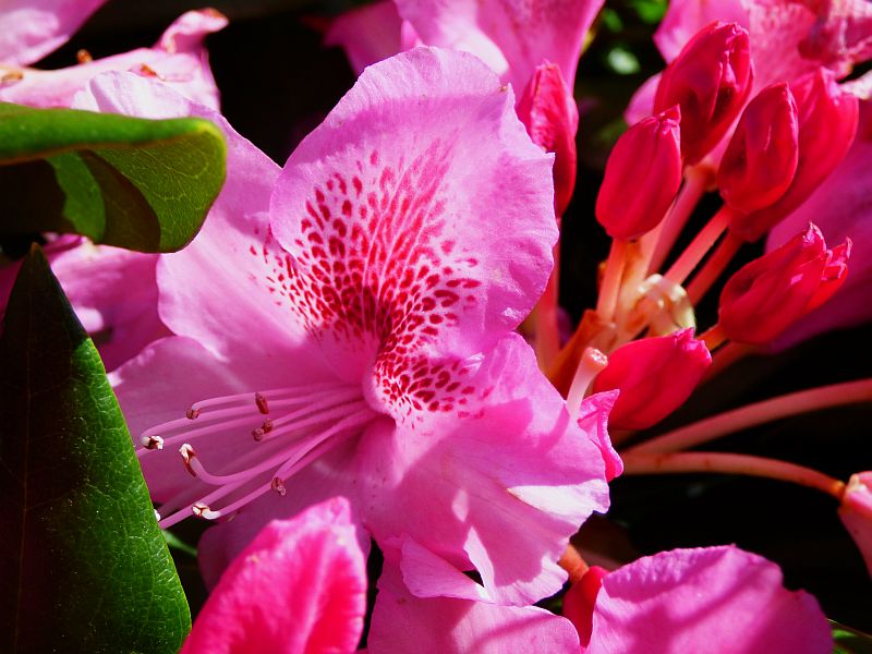 Kwiaty: w pąku intensywnie ciemnoróżowe, po otwarciu czysto różowe z wyraźną, bordowo cętkowaną plamą rozlewającą się na górnych płatkach... w miarę kwitnienia kolor blednie... brzegi płatków lekko pofalowane... lejkowate... duże, średnica pojedynczego kwiatu około 7,5 cm... zebrane po 10-18 sztuk w wierzchołkowe kwiatostany