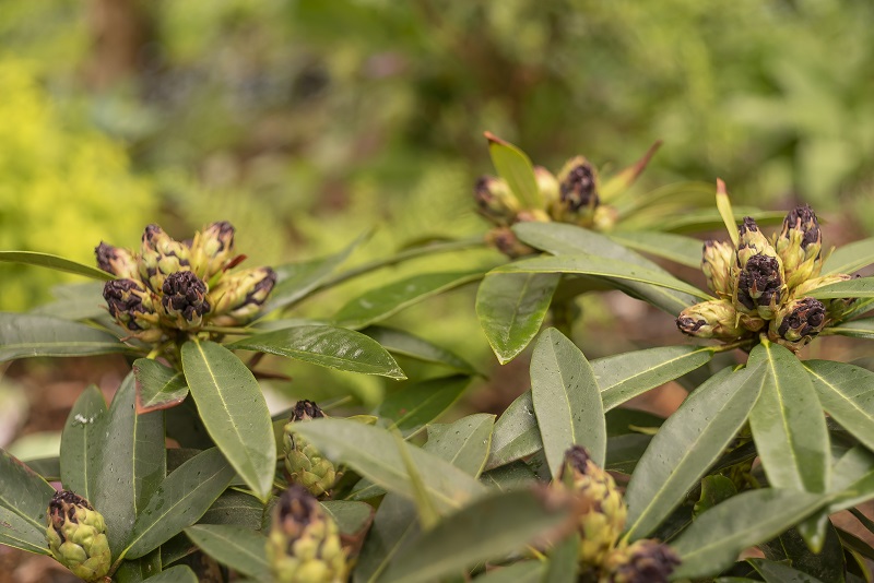 Nie wiem dlaczego, ale Dramatic Dark, jak oceniam na tę chwilę, dośc słabo zawiązał nowe pąki kwiatowe na nowy sezon. Rosnące po bokach dwa inne różaneczniki (Guneter Dinger i Mrs P. den Ouden) aż sa oblepione pąkami a on dośc skromnie.