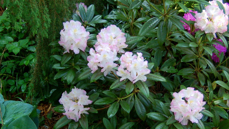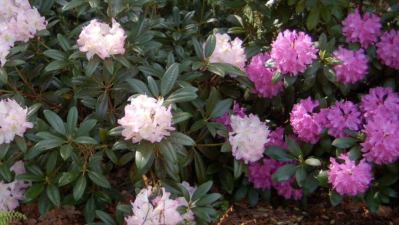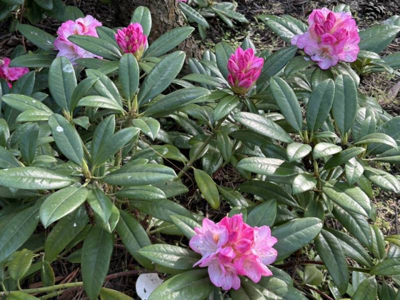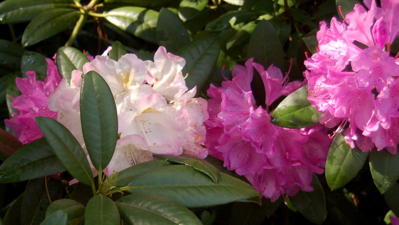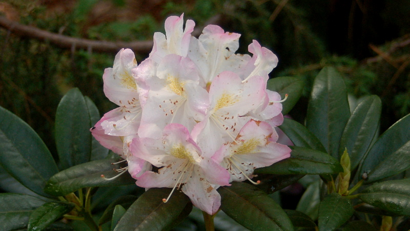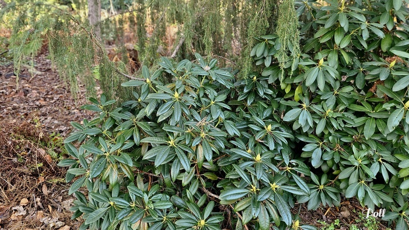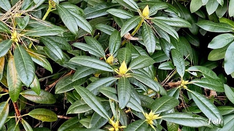 Liście: głęboko ciemnozielone, błyszczące... lancetowate, podwinięte w dół... o długości od 13 do 16 cm... utrzymują się na krzewie przez 3 lata