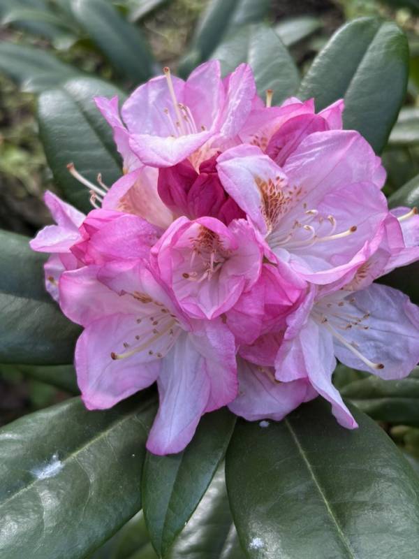 Kwiaty: w pąku różowe, po otwarciu dwukolorowe: białe centrum z jasnoróżowym marginesem i wyraźnym, żółtozielonym rysunkiem na górnym płatku... duże, średnica pojedynczego kwiatu od 7,5 do 9 cm... zebrane po 14-23 sztuk w zwarte, wierzchołkowe kwiatostany