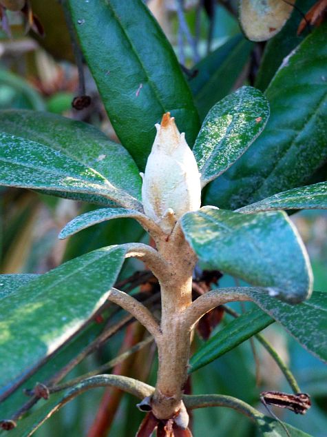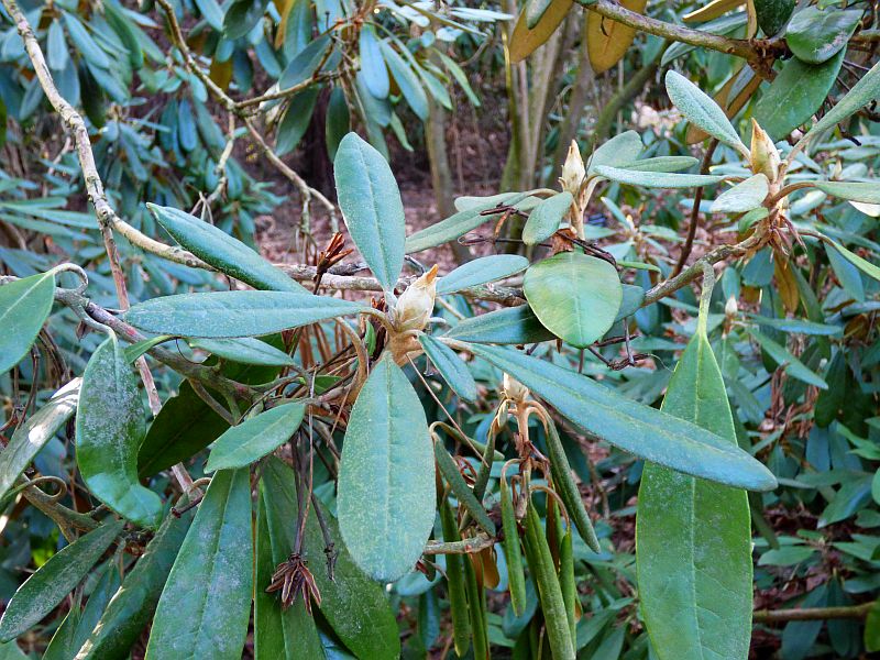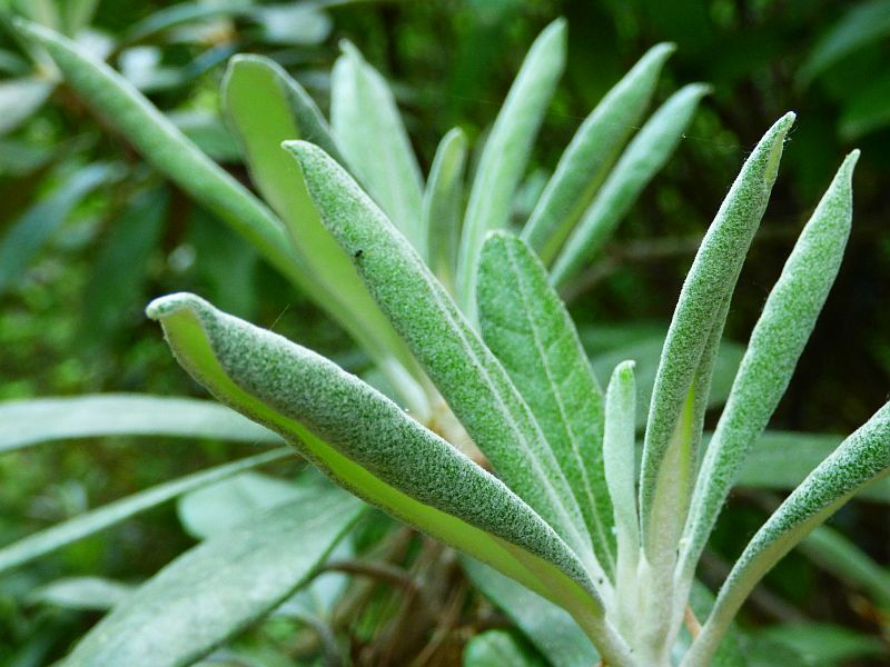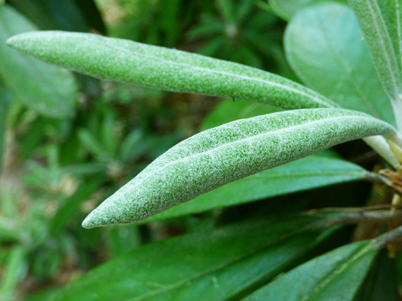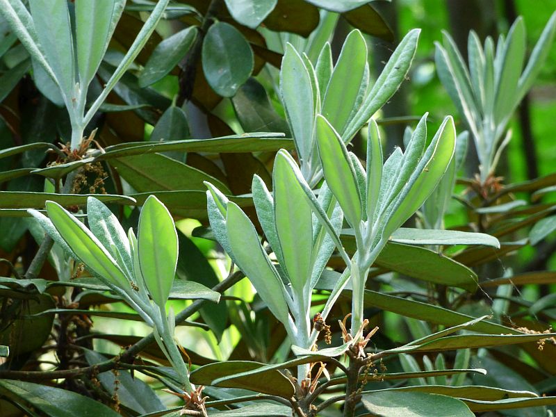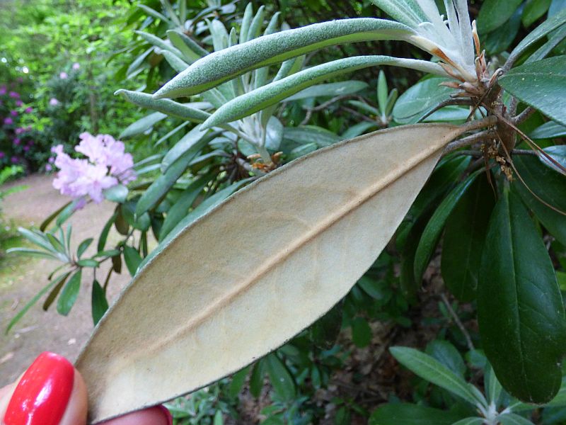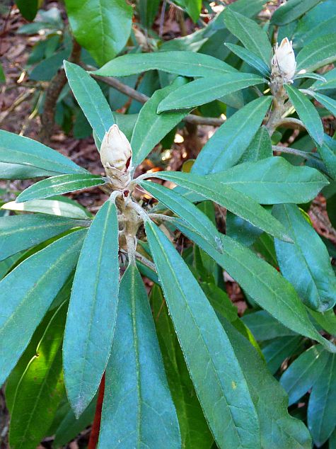 Liście: ciemnozielone, skórzaste i błyszczące z wierzchu, od spodu z gęstym, filcowatym, szarobiałym, cynobrowym, jasnobrązowym lub kasztanowym indumentum... lancetowate do eliptycznych z lekko podwiniętymi brzegami i tępym wierzchołkiem... o długości od 6,50 do 17,50 cm i szerokości od 2 do 3,50 cm... młode pokryte białym kutnerem... również ogonek pokryty białymi, wełnistymi włoskami... wyjątkowo długo utrzymują się na krzewie na krzewie, bo przez 3-5 lat