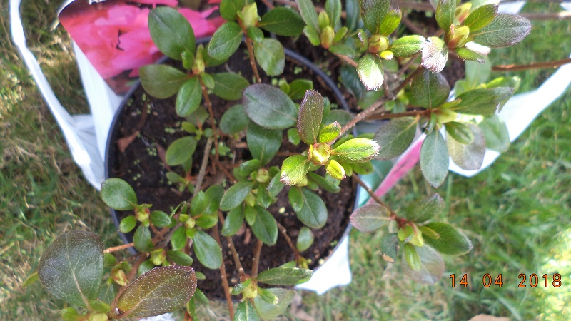 Azalki japońskie Melina dość ładnie zawiązały pąki i powoli rozpoczynają rozchylanie kwiatów. Niskie, bliskie zeru temperatury nieco opóżniają kwitnienie
