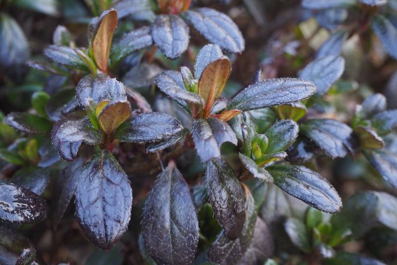 Na liściach ma włoski, a są takie błyszczące bo zdjęcia robiłem po przelotnym deszczu. Liście po zimie są ciemne, ale im głębiej w środek rośliny tym więcej zieleni.