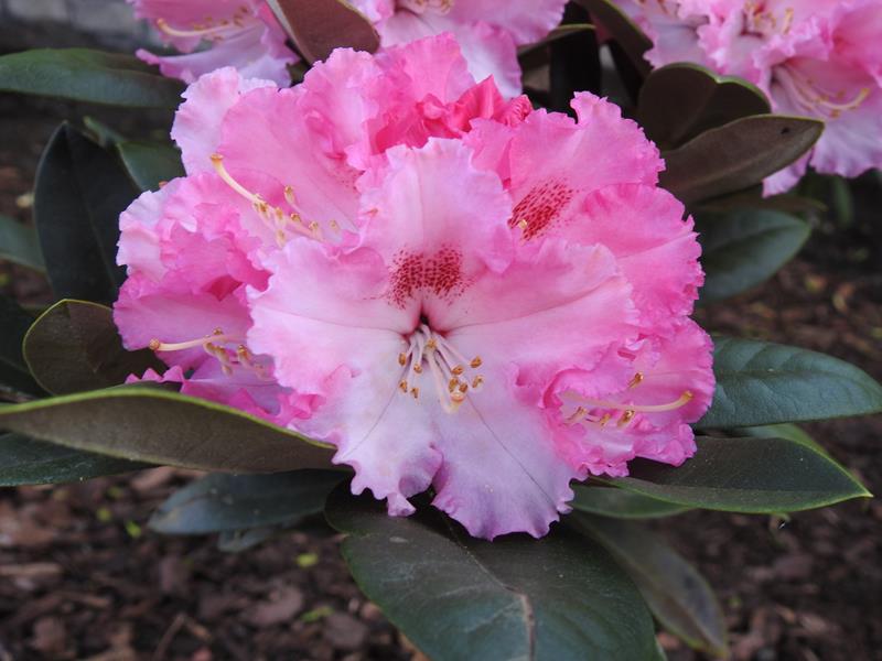 Selekcjoner: Wilhelm Sagemüller, Niemcy (wprowadzenie do handlu: 1986) Pokrój: płaskokulisty Siła wzrostu: roślina wolnorosnąca... po 20 latach dorasta do około 0,80 m wysokości i około 1,80 m szerokości Liście: szarawozielone z wierzchu, od spodu pokryte białą wyściółką... eliptyczne... o długości do 12,5 cm Kwiaty: w pąku intensywnie różowe, po otwarciu początkowo jasnoróżowe z ciemniejszymi, fryzowanymi krawędziami i białym centrum oraz wyraźną, ciemnoczerwoną plamką na górnym płatku, z czasem kolory blakną... lejkowate... zebrane po 12-14 sztuk w kuliste, wierzchołkowe kwiatostany Termin kwitnienia: druga połowa maja Mrozoodporność: do -20 °C (Ciepłucha; Heinje)/ -23 °C (ARS)/ -24 °C (Schmalscheidt)