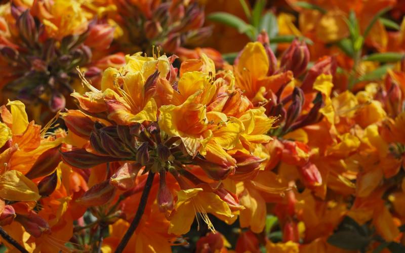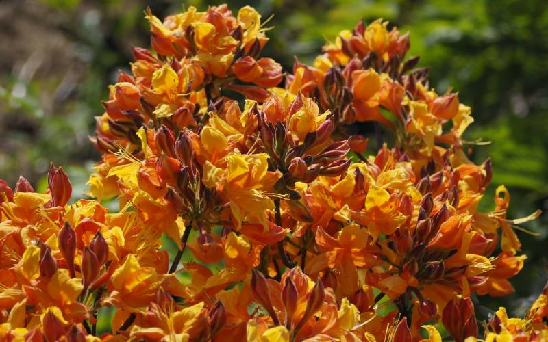 Kwiaty >> azalii sprzedawanej pod tą nazwą na rynku polskim: w pąku czerwone, po otwarciu pomarańczowe z wyraźną, ciemnopomarańczową plamką na górnym płatku... zebrane po kilkanaście sztuk w efektowne, wierzchołkowe kwiatostany
