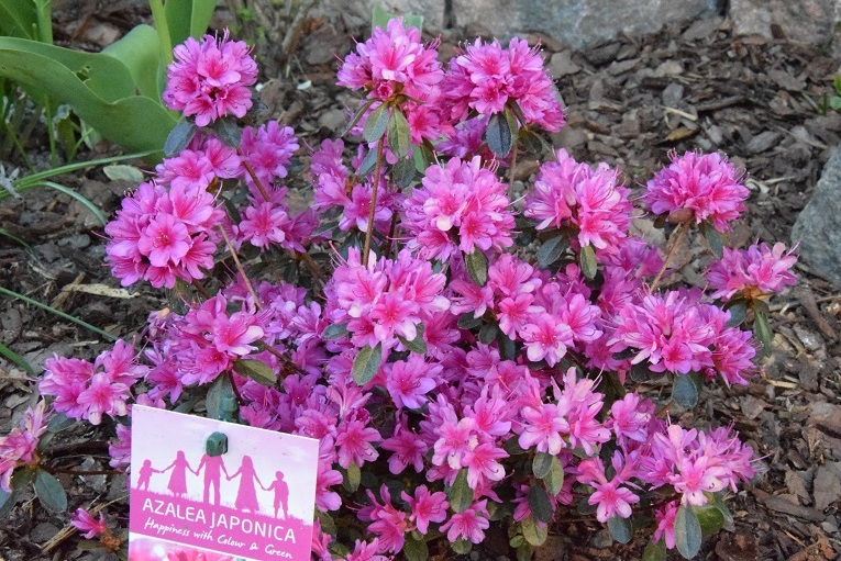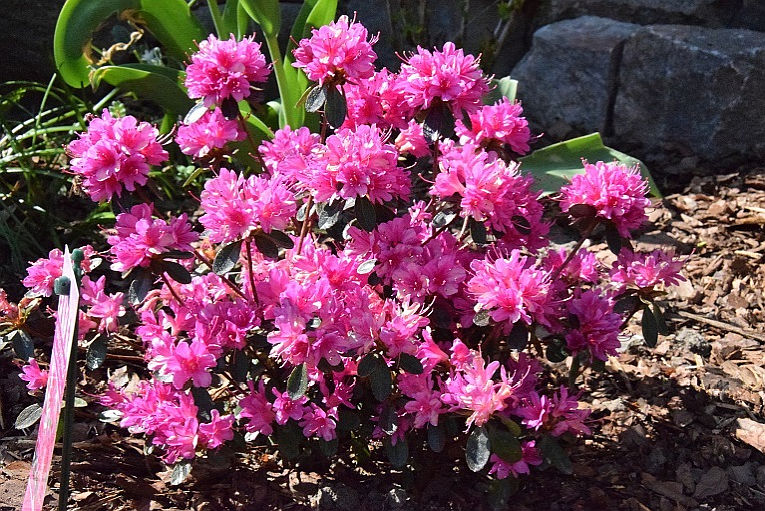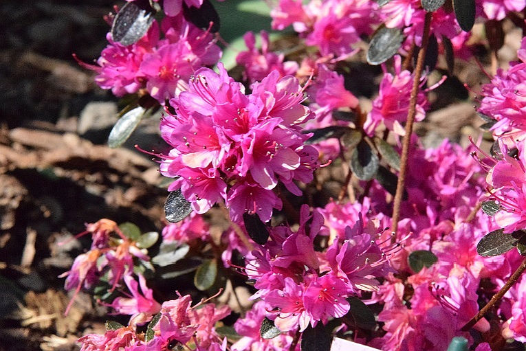 Kwiaty: intensywnie purpurowo różowe, bez rysunku... podwójne typu 'hose in hose'... lejkowate... drobne, średnica pojedynczego kwiatu do 2,3 cm... liczne, zebrane po 2-3 (do 6) sztuki na końcach pędów
