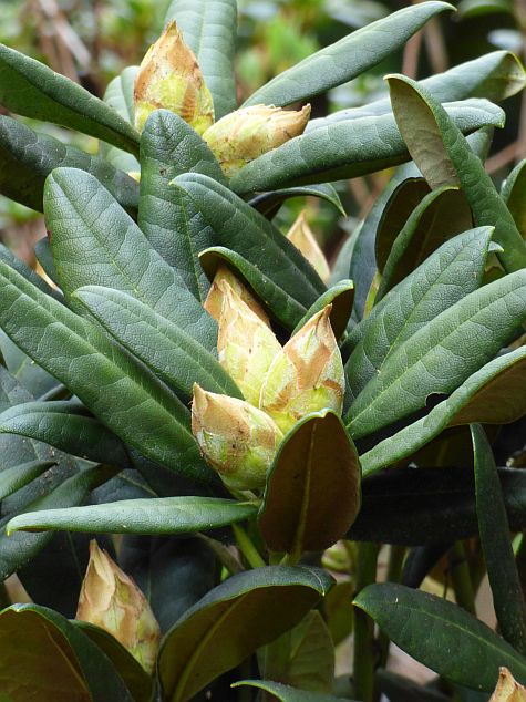 Liście: ciemnozielone i lekko błyszczące z wierzchu, od spodu pokryte beżowym indumentum... eliptyczne... o długości do 12,7 cm przy szerokości do 4,5 cm