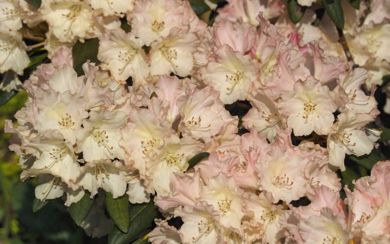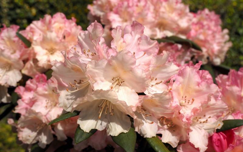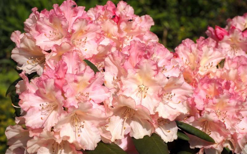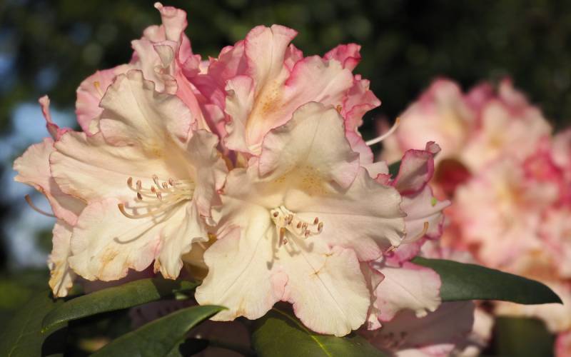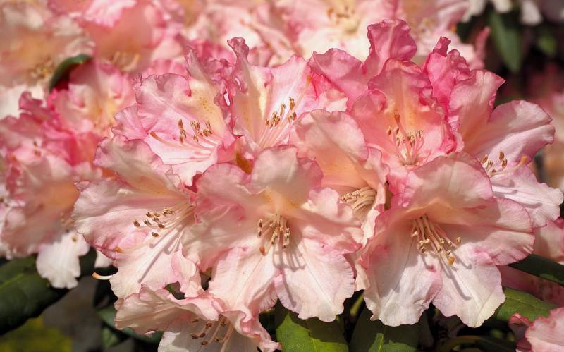 Kwiaty: w pąku jasnoczerwone... po rozwinięciu delikatnie różowe z żółtawo kremowym centrum oraz słabo zaznaczonymi, żółtymi cętkami na górnym płatku... wraz z upływem czasu jaśnieją... brzegi płatków pofalowane... lejkowate... średnica pojedynczego kwiatu do 6 cm... zebrane po 10-14 sztuk w kuliste, wierzchołkowe kwiatostany