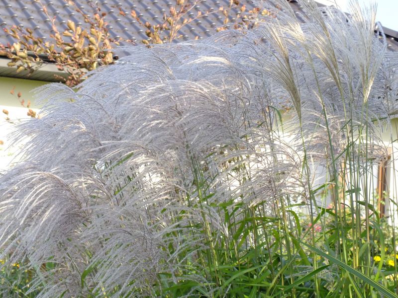 Mój miskant 'Memory' nabiera rozpędu w rozwijaniu kwiatów. Z godnością z nosi to upalne i ekstremalnie suche lato, choć niemal jest niepodlewany.