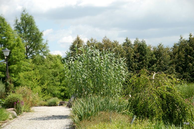 Lasecznica trzcinowata (Arundo donax) w arboretum w Bolestraszycach, rośnie blisko stawu , ale nie na tyle, by mieć bezpośredni kontakt z wodą