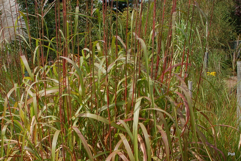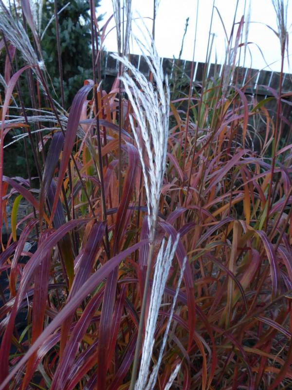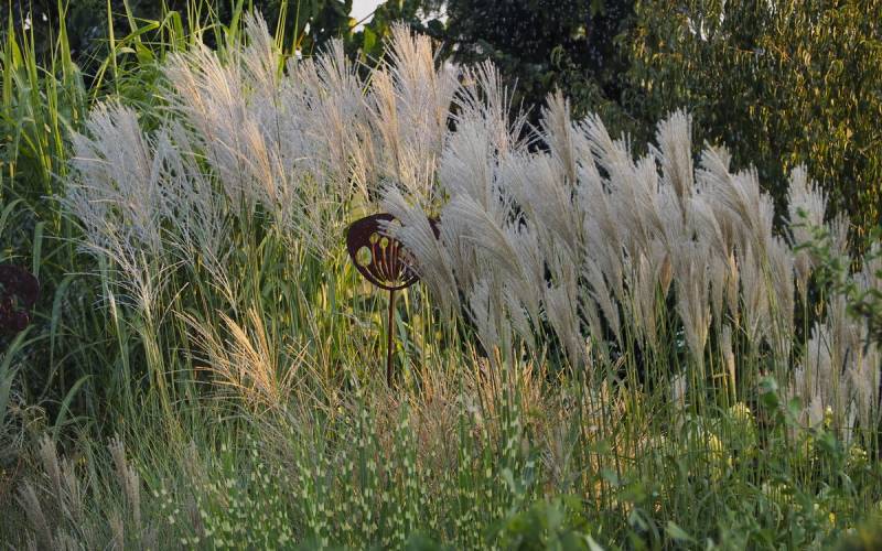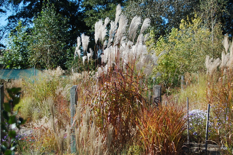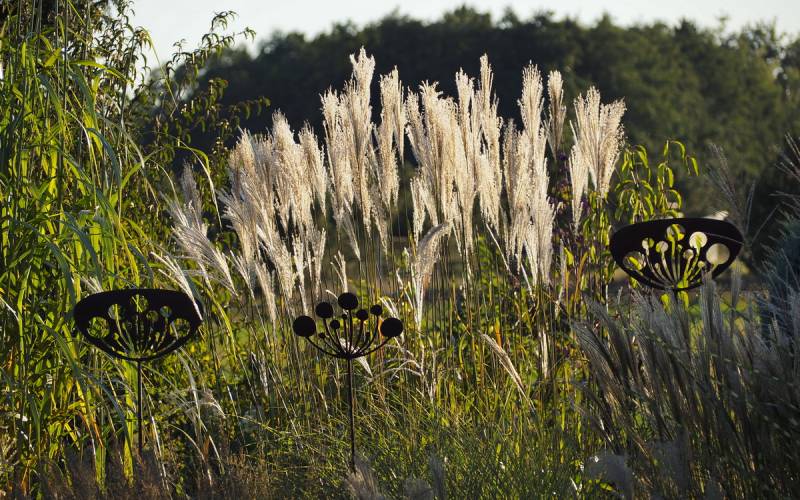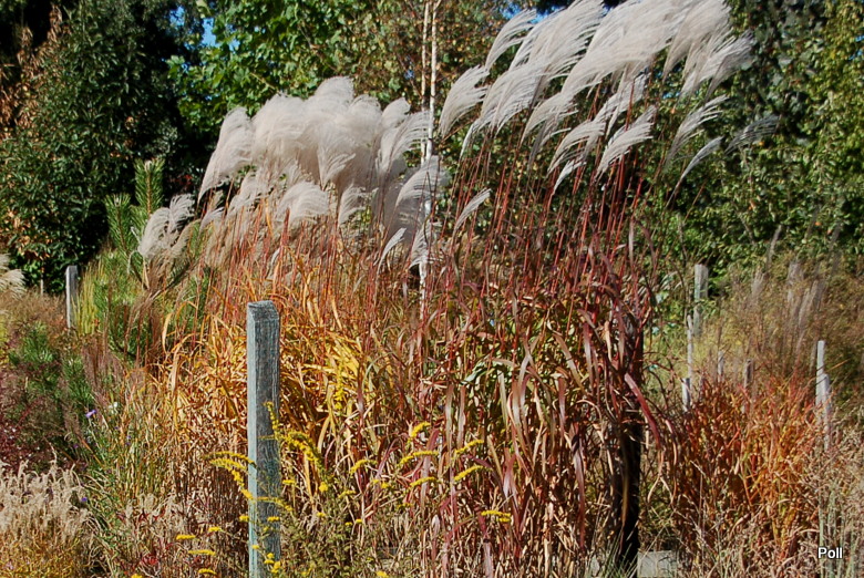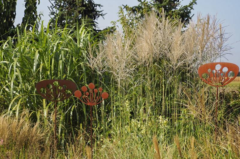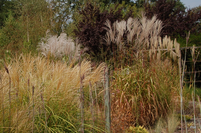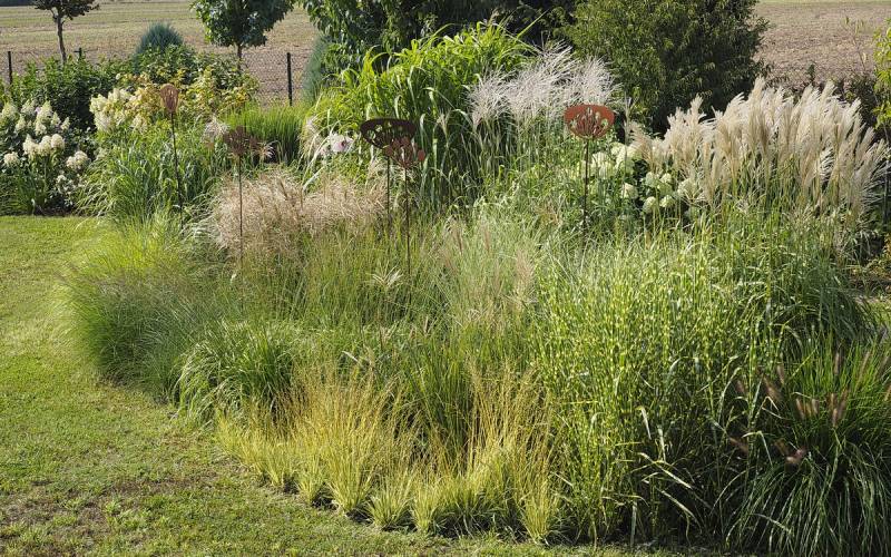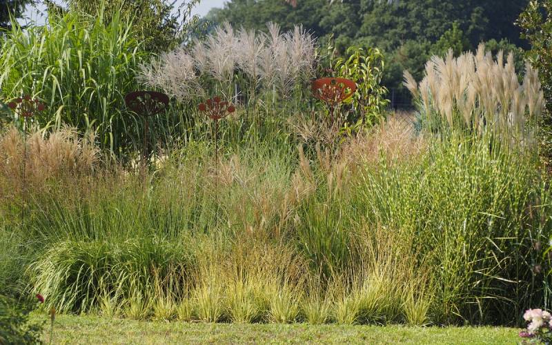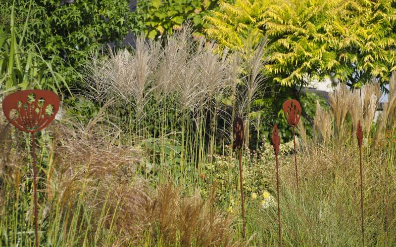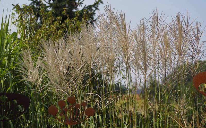 W grupie traw ozdobnych, na środku, góruje nad innymi (po lewej, z białymi kwiatostanami, miskant Memory, Rosi i miskant JP3)