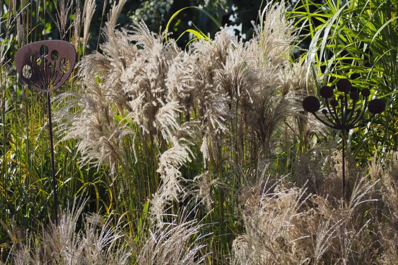 Kwiatostany: o pięknej, krwisto różowej barwie, połyskujące, duże w kształcie pióropuszów, później srebrzyste, osadzone wysoko ponad liśćmi, kwiatostany pojawiają się już w sierpniu