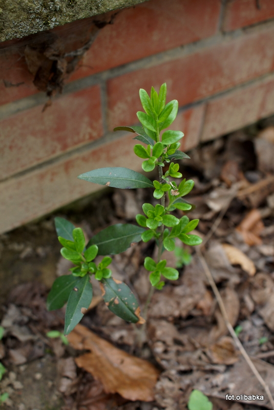 Obstawiam Ligustr pospolity. Nasionka przenoszą ptaki więc może wyrastać w zupełnie niespodziewanych miejscach :nie_wiem