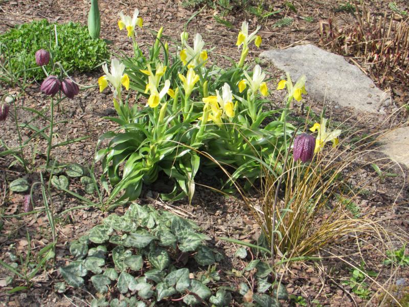 Zdjęcia z 18 kwietnia 2017 – irys bucharski rozpoczyna kwitnienie. Kępy wydają się niższe niż w tamtym roku, ale wydaje mi się, że to kwestia niskiej temperatury. Myślę, że w trakcie kwitnienia podrosną.
