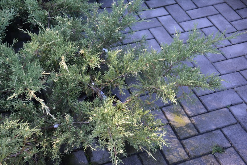 Przyjmuje spłaszczony pokrój. Część gałązek przebarwia się na żółty kolor