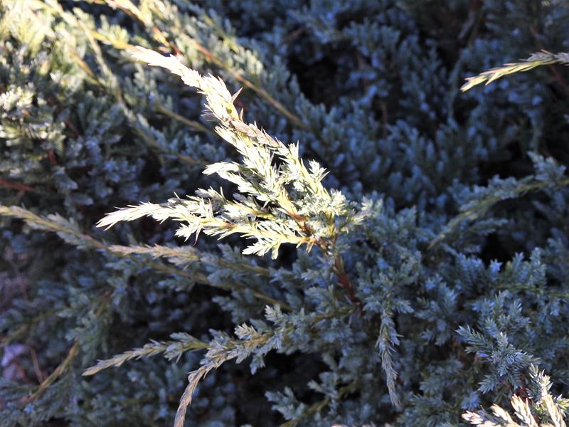 Dwubarwny jałowiec,tworzący niskie nieregularne kremowo-niebieskie poduchy