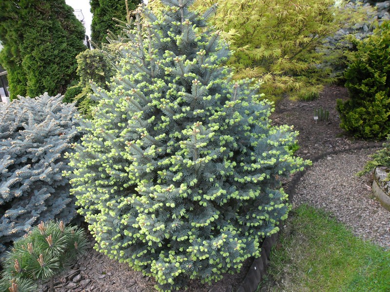 Idealnie stożkowa odmiana o niespotykanym niebieskim kolorze igieł, utrzymujących się bardzo długo na gałęziach, dzięki czemu drzewko nie łysieje od środka. Wiosną niezwykle widowiskowo prezentuje się kontrast pomiędzy szmaragdowymi przyrostami i niebieskimi starszymi igłami.