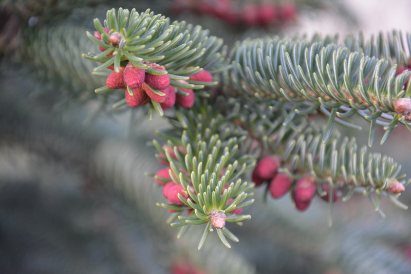 Ułożone promieniście wokół pędu sztywne igły o długości 2-3 cm. Ich górna powierzchnia jest błyszcząca, zielona, na dolnej są dwa białe, równoległe paski. Brzeg skórzasty, matowy.