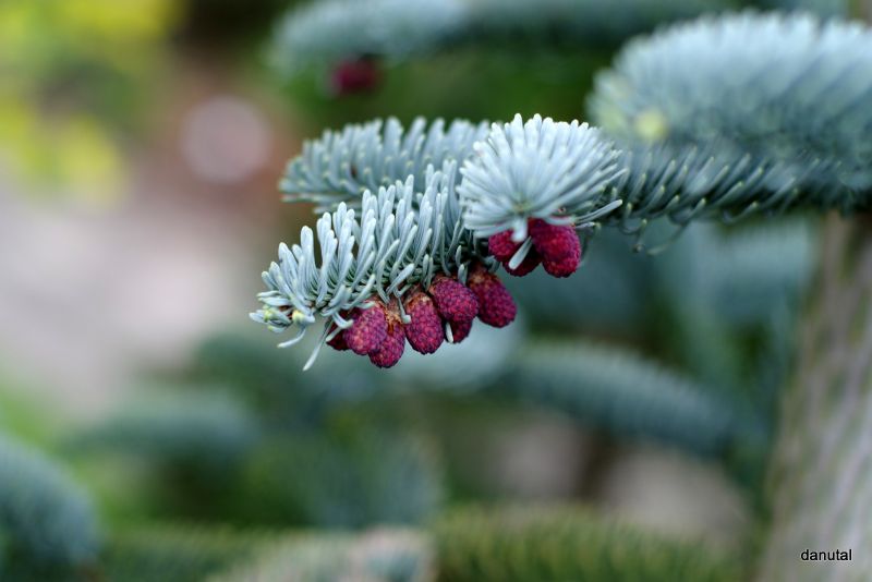 Kwiaty męskie bardzo liczne na dolnej stronie młodszych gałęzi, przede wszystkim w górnej strefie korony, początkowo mają jaskrawą barwę karminowoczerwoną, w trakcie pylenia stają się jasnożółte, kuliste o średnicy około 6 mm. Kwitnie od kwietnia do maja.