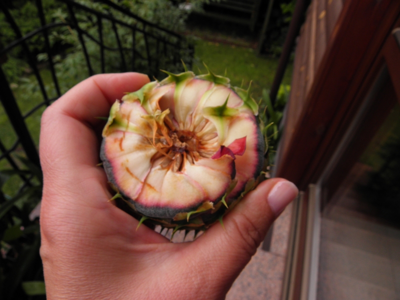Koloru jasnobrązowego, o jasnych odstających, ostrych łuskach, duże, wzniesione pionowo. Poszczególne łuski posiadają specyficzne wyrostki.