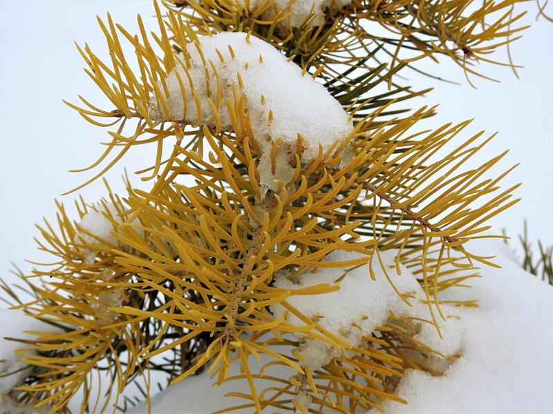 Igły: krótkie, wygięte, w szmaragdowym kolorze, natomiast młode przyrosty są seledynowe, co sprawia, że wiosną roślina jest wyjątkowo