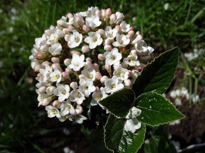 Kwiaty: rurkowate, zebrane w kuliste kwiatostany, białe, w pąku blado różowe, silnie pachnące, pojawiają się na przełomie kwietnia i maja.