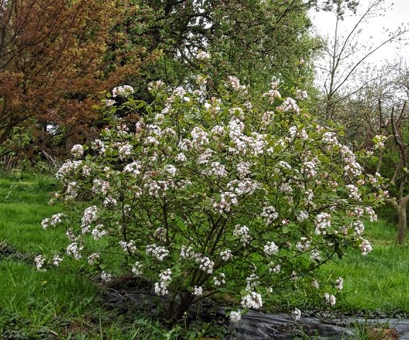 Piękna, pachnąca odmiana kaliny, kwitnąca już w kwietniu. Kwiaty woskowate, silnie pachnące w kolorze białym. Pokrój kulisty o luźnej strukturze. Odmiana osiągająca niewielkie rozmiary - do 150 cm - przy czym jest szersza niż wyższa, rośnie dość wolno. Owoce czarne, najczęściej w naszym klimacie opadają zanim dojrzeją, u mnie zawiązują się 2-3 kiście na całym krzewie. Bardzo odporna na mróz - strefa 4. Odmiany nie należy przycinać gdyż zakwita tylko na starszych pędach! Posadzenie jej na lekko zacienionym miejscu pozwoli na dłuższe kwitnięcie.