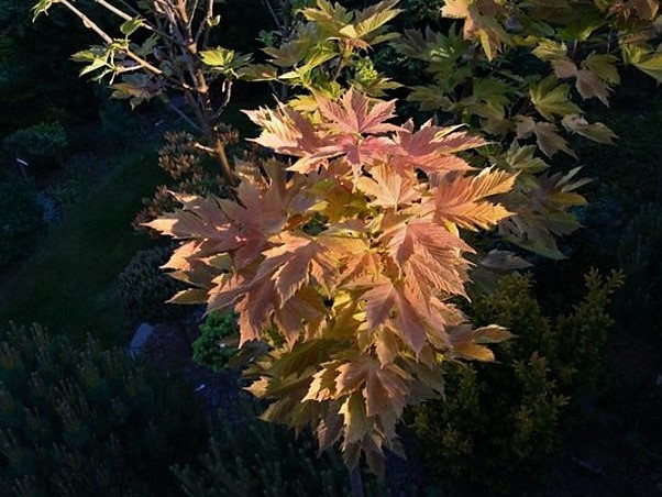 Liście: klapowate, średniej wielkości, brzegiem piłkowane, wiosną łososioworóżowe, później różowe, latem jasno zielone z różowym podbarwieniem, natomiast jesienią przebarwiają się na żółto-pomarańczowo.
