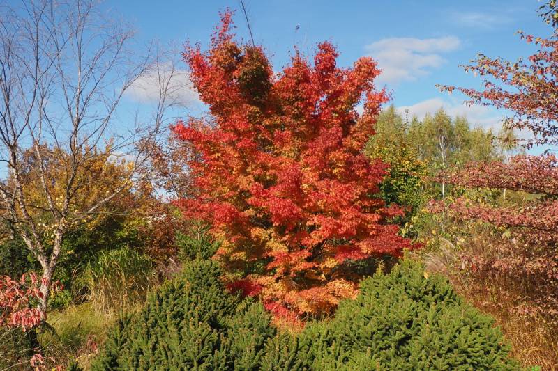 Liście: niewielkie, 5-7 klapowe, wiosną kremowo, czerwono, różowe, latem zielone z różowymi i kremowymi akcentami, kolory są żywe, wyraziste.