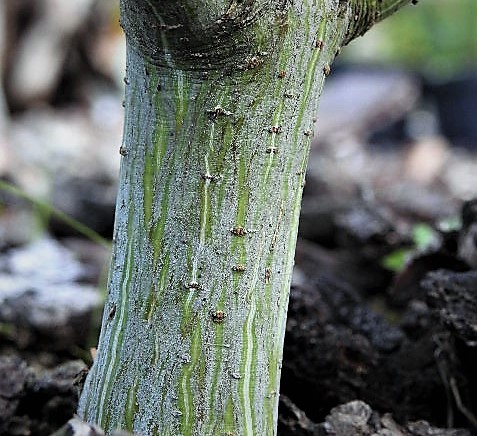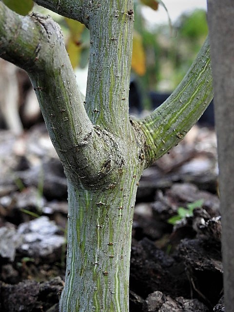 Kora: na młodych pędach purpurowo-czerwona z podłużnymi, kremowymi prążkami, na pniu i starszych konarach oliwkowozielona z białymi prążkami,