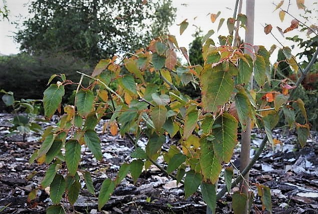 Liście: ciemnozielone, owalne w zarysie, lekko klapowane, czerwone ogonki liściowe, jesienią przebarwiają się na żółtopomarańczowo.