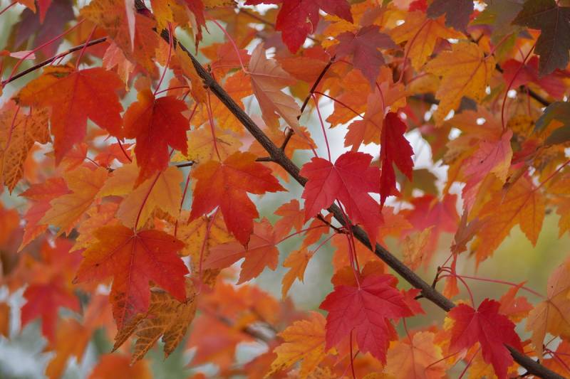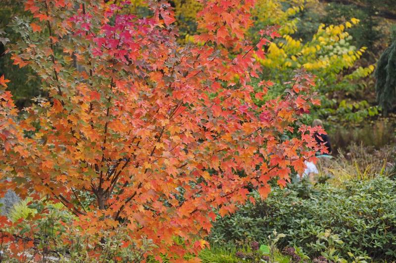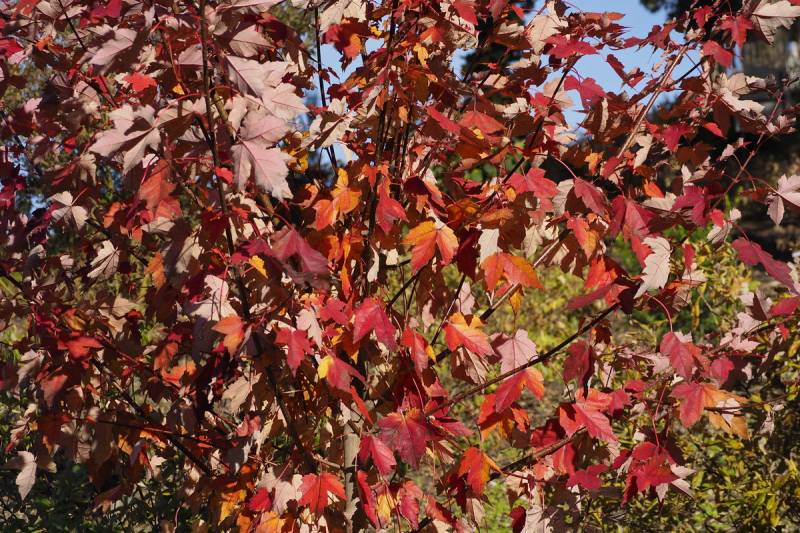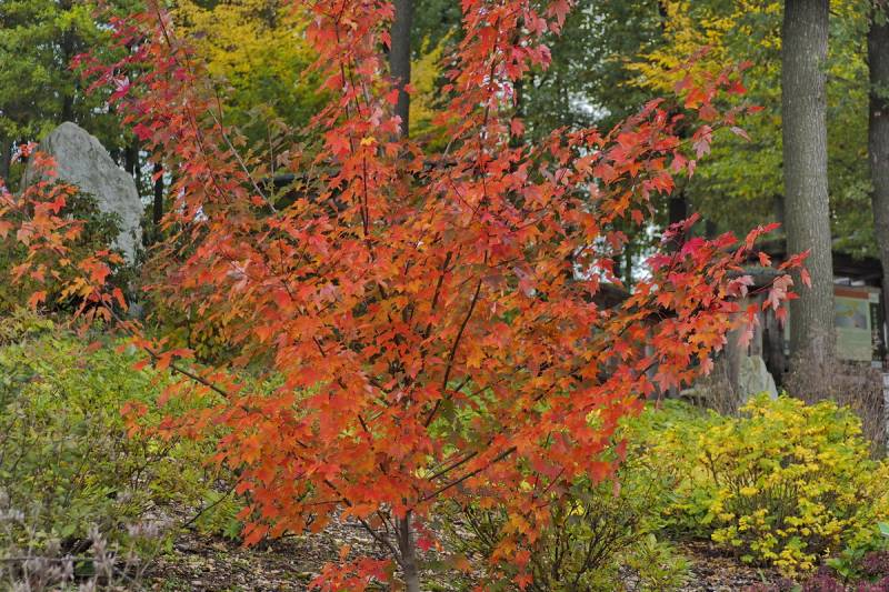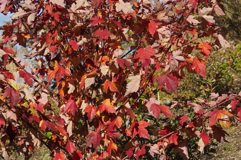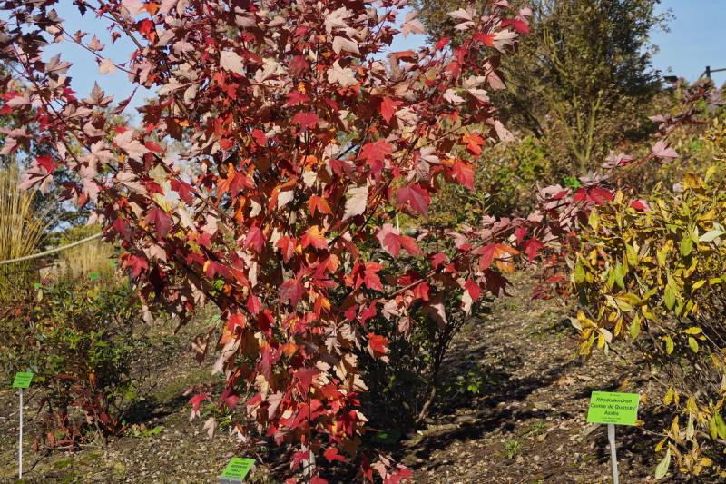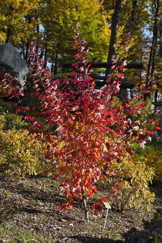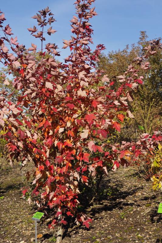 w przeciwieństwie do gatunku jego liście nie ulegają chlorozom i żółknięciu w przypadku uprawy na glebach o nieodpowiednim, zbyt wysokim pH Wielkość: dorasta do 15 m wysokości, ma silny przewodnik i regularnie ułożone gałęzie, tworzy szeroko-stożkowatą koronę Liście: trójklapowe, na brzegach nieregularnie ząbkowane, u nasady sercowate, z wierzchu ciemnozielone i błyszczące, od spodu jaśniejsze, matowe, jesienią przebarwiają się na intensywnie czerwony kolor. Mrozoodporność: dobra.