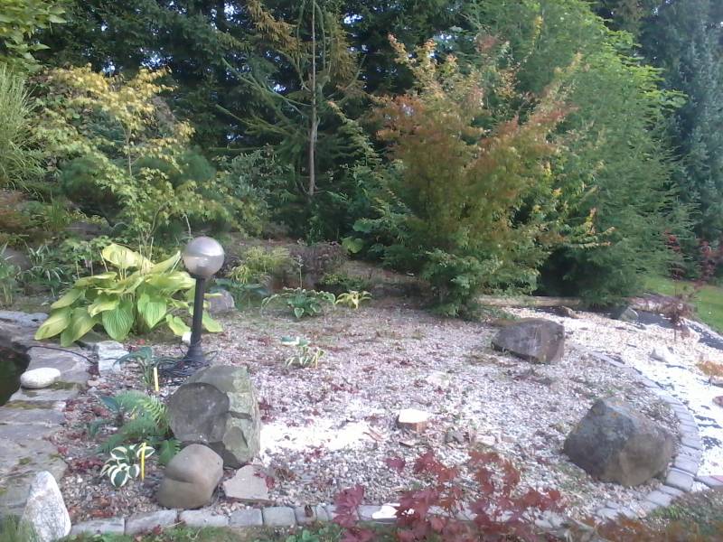 Korzenie tych wykopanych dzisiaj są w porządku , pień ściętego w środku bialutki . Może za dużo ciągnął wody a mrozy zrobiły resztę , od małych pęknięć się zaczęło . Teraz będą tu wysokie miskanty , bo muszą zasłonić hosty i oczko . Poniżej na tych bielszych kamieniach od tamtego roku są dwa shirasawy . Dwa metry powyżej jest mega susza od świerków , wszystko w lecie usycha a tu takie bajoro . Może gunnerę manicatę kupię i tam wsadzę , ale do miskantów nie będzie pasowała .