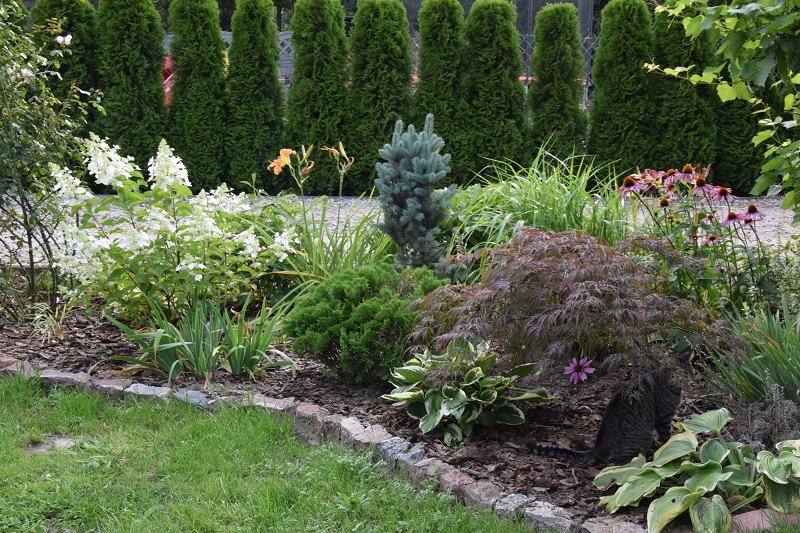 Świetnie się komponuje z innymi krzewami, tu po prawej hortensja Bobo, po lewej Pinky Winki.