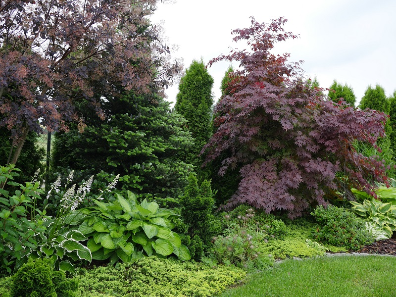 Atropurpureum, z perspektywy (i z bliska)... Ten z prawej strony jest już ogromny, ma jakieś 3m wysokości, bardzo rozłożysty...