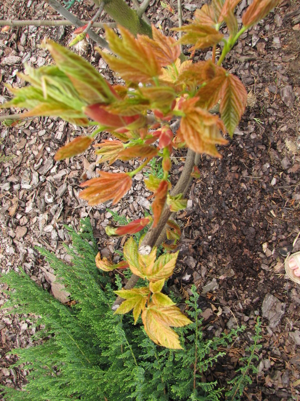Mój egzemplarz klona 'Esk Sunset' został dość wysoko podkasany a tej wiosny obie odnogi zostały mocno zdystansowane od siebie drewniana poprzeczką
