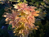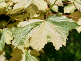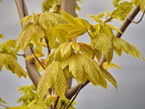 Imponujące drzewo, dorastające do 40 metrów wysokości o szerokiej, kulistej koronie. Pień pokryty łuszczącą się tafelkowato korowiną. Liście duże, grube, 5-cioklapowe. Jesienią przebarwiają się na żółto lub pomarańczowo. Kwitnie przed rozwoje liści na przełomie kwietnia i maja.