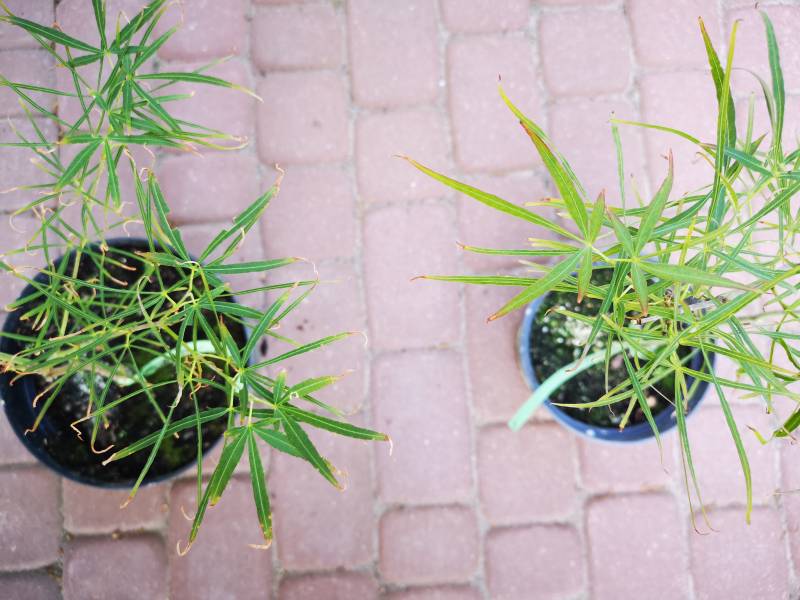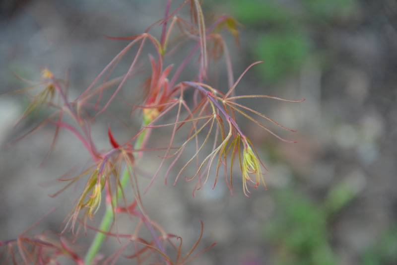 Liście: wiosenne świeże przyrosty intensywnie pomarańczowo-czerwone, bardzo mocno powcinane, często tylko w postaci nerwu. Później ciemnieją
