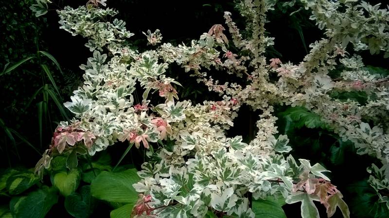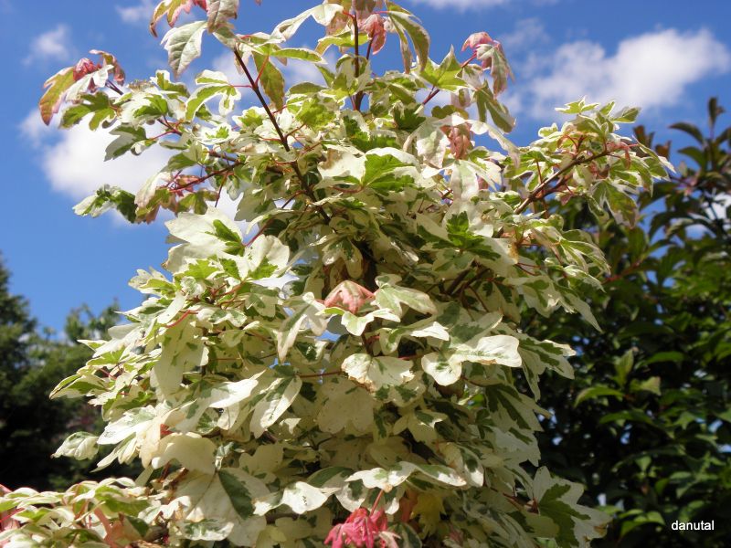 Liście: 3- do 5-cioklapowe, do 10 cm szerokości, zaokrąglone, dwukolorowe: ciemnozielone centrum z szerokim, kremowobiałym obrzeżem, młode liście i pędy różowawe