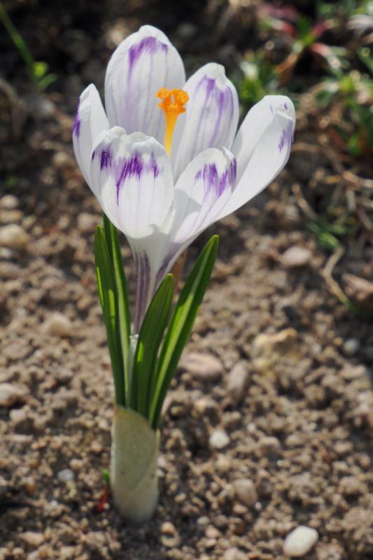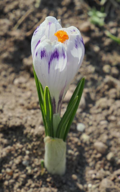 Jest to wcześnie kwitnący krokus o białych kwiatach z ciemnymi paskami na zewnętrznej stronie płatków.