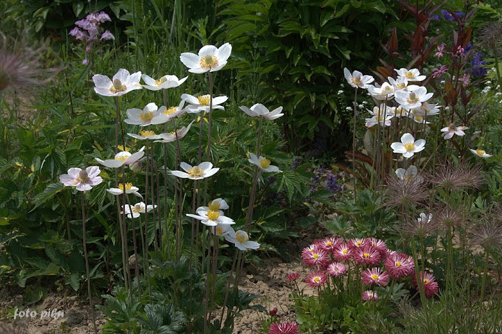 Stokrotki w towarzystwie zawilców w ogrodzie piku