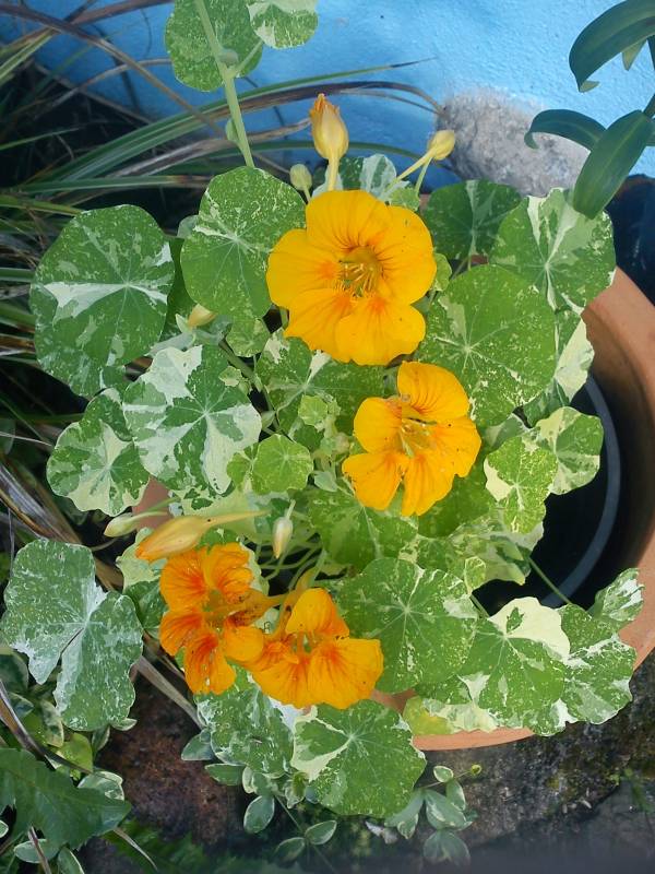 Po kilku latach przerwy posiałam nasturcję -miałam resztkę nasion - 5 szt. odmiany Alaska, długo było zimno i nie miałam wielkich oczekiwań, że wzejdą, ale się udało. Towarzyszyły w skrzyni kapuście. Mszyc nie było w ogóle, a sezon deszczowy, więc nasturcja się spisała. Piękne liście i kwiaty (lubię skubnąć i zjeść).