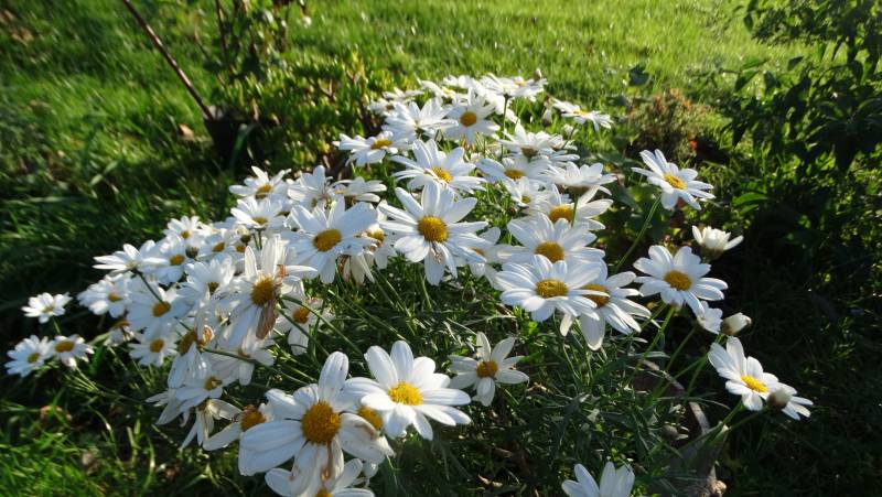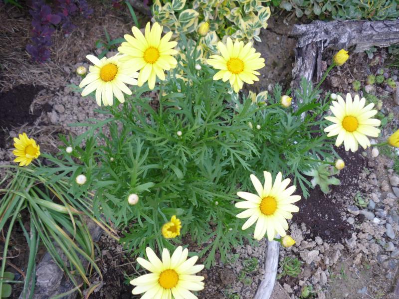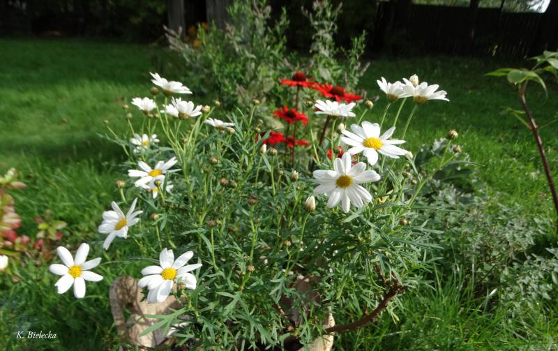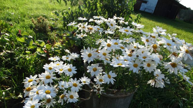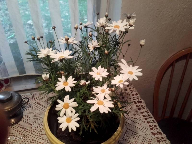 To bardzo efektowna odmiana z żółtymi kwiatami zaprezentowana u góry. Złocień krzewiasty pochodzi z Wysp Kanaryjskich. W tłumaczeniu nazywany jest także paryską margerytką. Mój jest biały z seledynowymi listkami, zimuje z chacie.